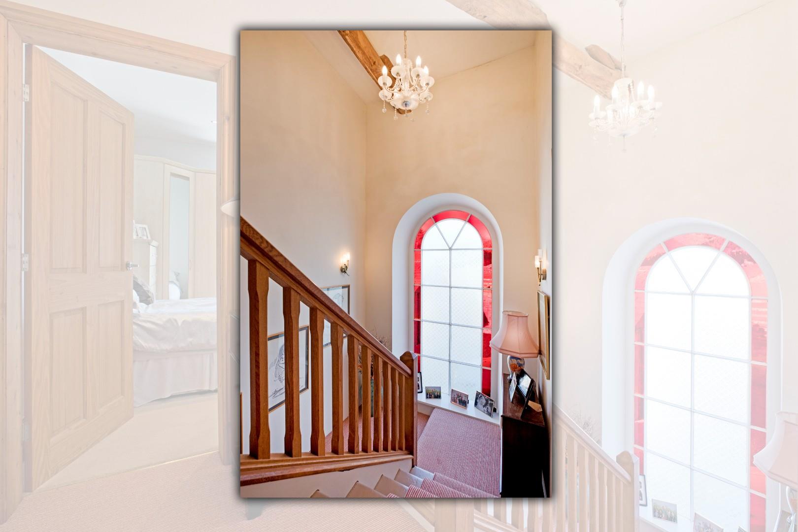 A broad, original, return staircase with solid, timber balustrade, carpet runner and carpet rods leads up to the spacious, first floor carpeted landing. The tall, arched, decorative, stained glass window allows light to flood in and is a stunning feature of this charming home. Wooden beam, radiator, wall lights and room for an item of furniture. A walk-in cupboard houses the hot water tank and provides generous storage for towels and linen.