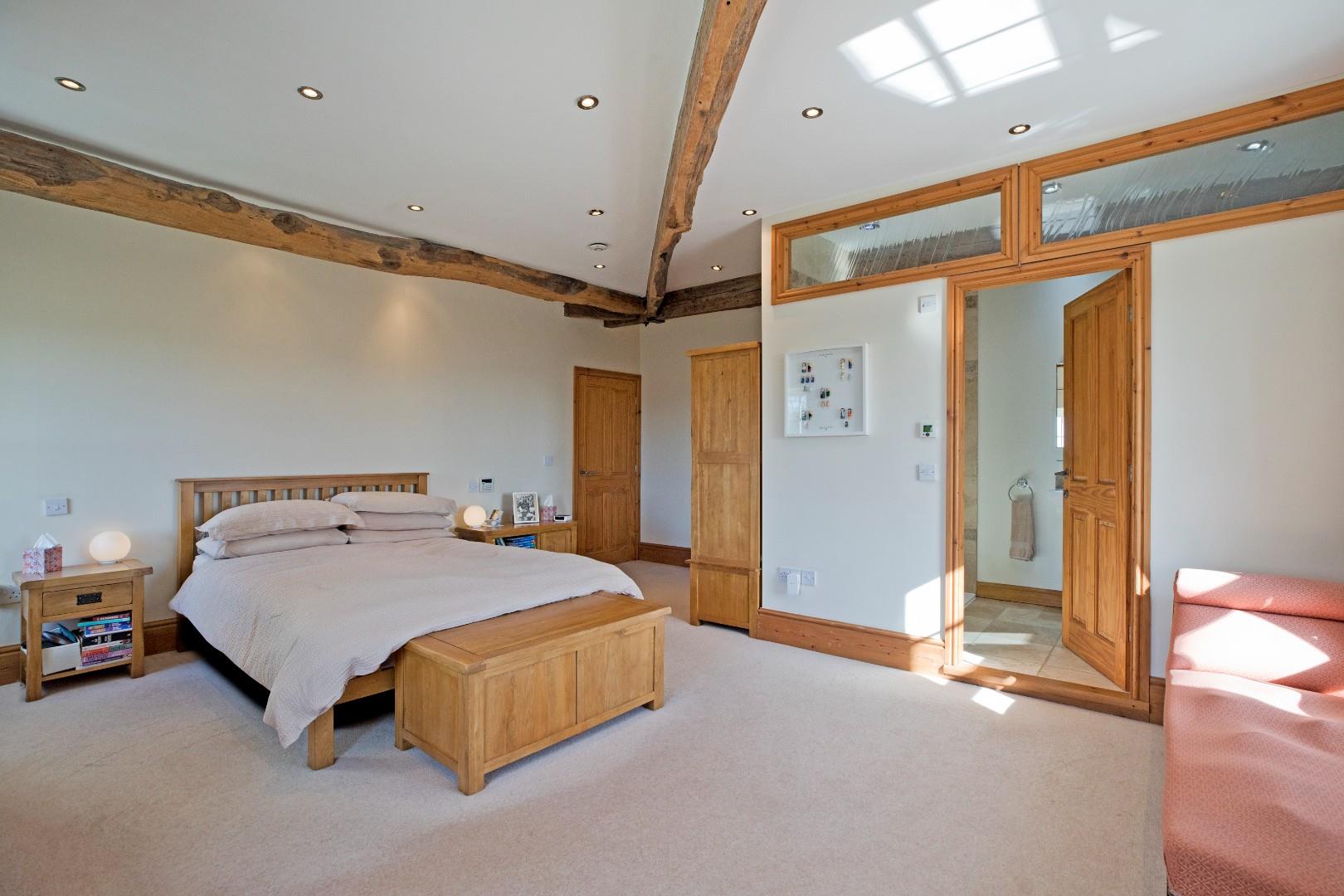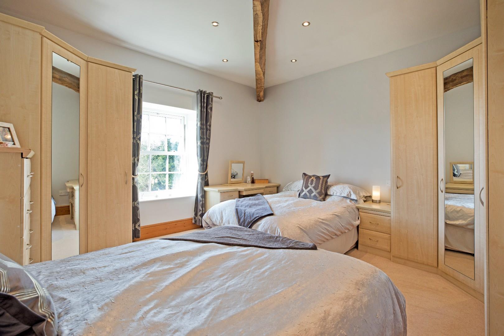 A further well-proportioned, double bedroom, even large enough to accommodate two double beds! The window affords beautiful, long distance countryside views. Modern, fitted furniture to include wardrobes, chest of drawers and bedside table. Beam, carpeting, downlighting and radiator.