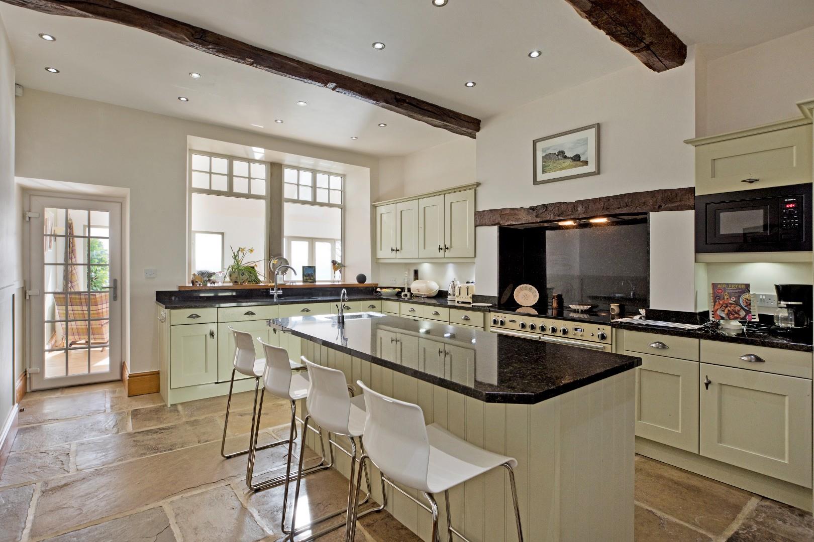 A beautifully appointed kitchen fitted with wooden fronted base and wall units with pewter handles and with complementary granite worksurface and upstands over. Rangemaster oven with five burner induction hob over, granite splashback and extractor over. Integrated appliances include a Bosch dishwasher, Bosch microwave and bin storage. Space for an American style fridge/freezer. An inset Villeroy & Boch one and a half bowl sink with monobloc tap sits beneath a large window looking through the fabulous garden room towards the stunning countryside views. A multi-paned timber door opens into the garden room. Additional storage and a further inset ceramic sink is provided in a large central island, which accommodates breakfast bar seating for four people. The kitchen is brimming with charm and character with features such as exposed beams, an original stone floor and an original, traditional safe. The kitchen is open into the garden room making it conducive to entertaining. Stylish, wooden panelling to half height on one wall and radiator. Downlighting and TV point.