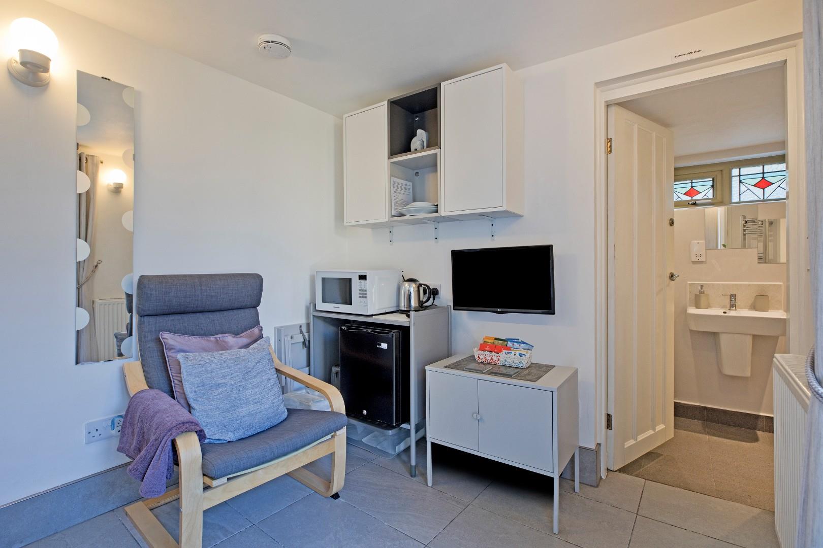 A glazed door with glazed side panel opens into a seating area with room for a couple of armchairs. Practical tiled floor, kitchenette space with room for a small fridge, microwave and kettle. Fitted wall cupboard provides useful storage. TV point, radiator, wall light and fitted hanging rail. A door opens into: