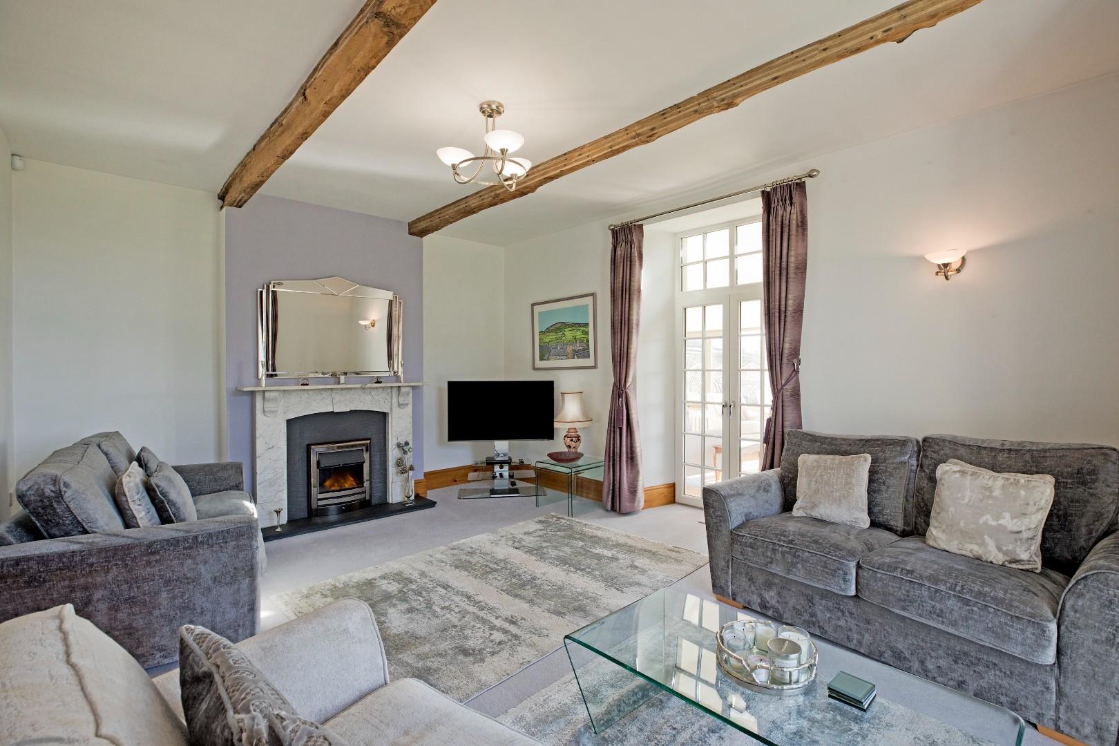 A wonderful lounge of lovely proportions. Double multipaned doors with transom light over frame the most breathtaking views over the delightful garden and the far reaching countryside vista, enhanced by a further set of double doors with transom over leading into the Garden Room accentuating the bright atmosphere and providing more superb countryside views. A beautiful, marble fireplace with slate fireback and hearth houses a gas fire. Carpeting, beams, two radiators, wall lights and TV point.
