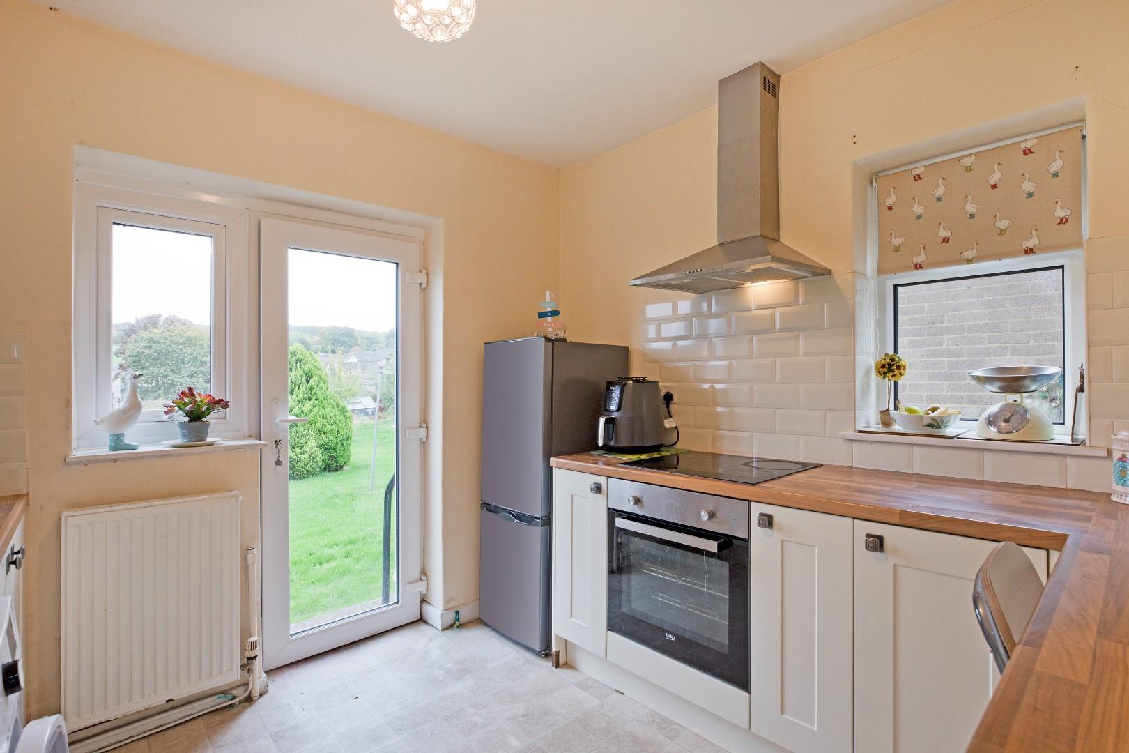 A well presented breakfast kitchen fitted with a range of cream Shaker style cabinetry with wood effect worksurfaces and Metro tiling to splashbacks, also incorporating a handy breakfast bar. Appliances include electric oven, four ring hob with stainless steel extractor over and there is space and plumbing for a washing machine and tall fridge freezer. Tile effect vinyl flooring, radiator, two, double glazed windows, in addition to a fully glazed uPVC door allowing ample natural light and enjoying wonderful long distance views, giving access to a patio area and the large, communal lawned gardens to the rear.