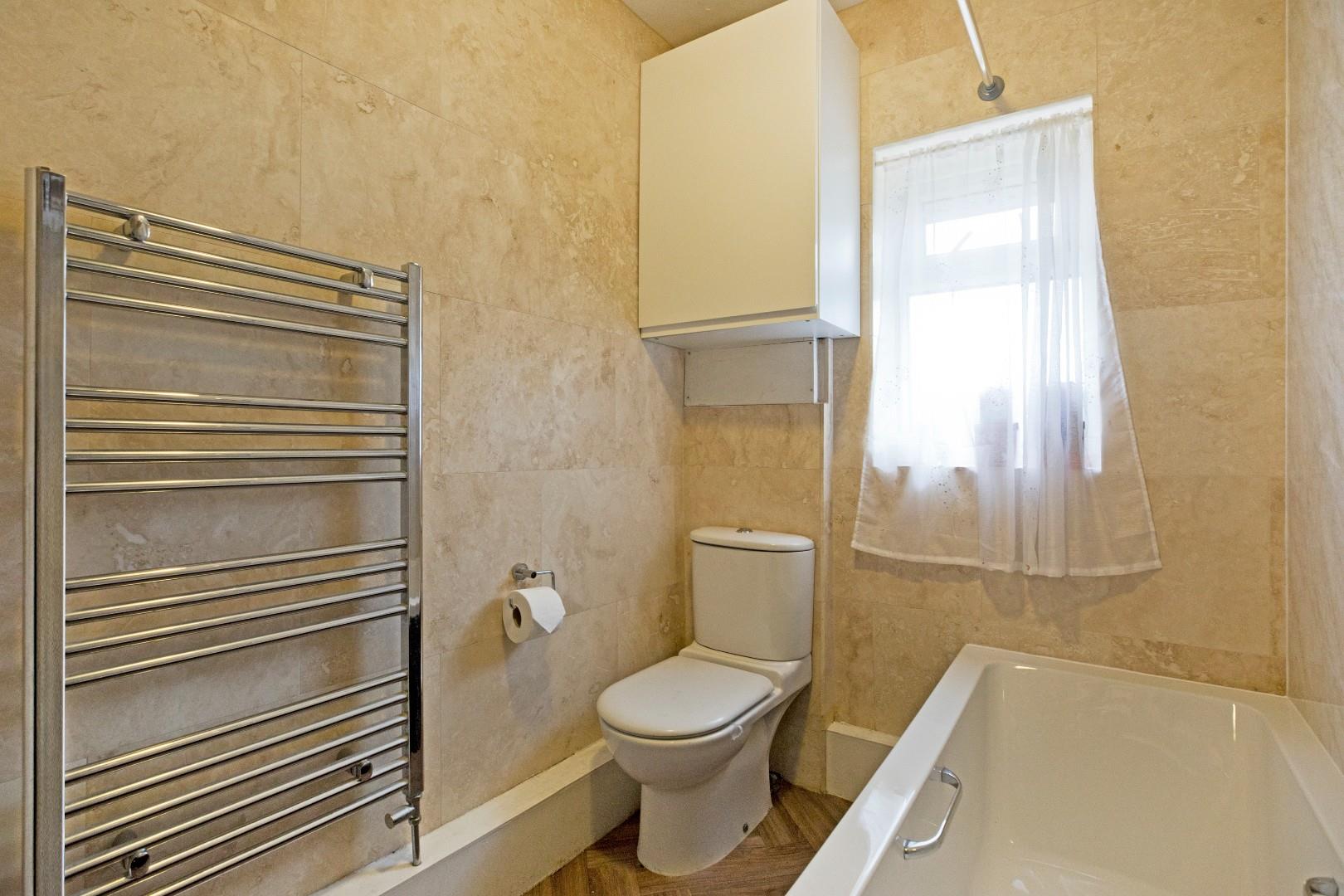 A well presented, modern, three-piece bathroom with low-level W.C., handbasin with chrome mixer tap set in a vanity cupboard with wall mirror over and panel bath with thermostatic shower and waterproof boarding to walls. Neutral wall tiling, chrome, ladder style, heated towel rail, wall mounted cupboard housing the recently installed gas central heating boiler, ceiling light. Newly fitted, parquet style vinyl flooring, obscure, double glazed window to rear.