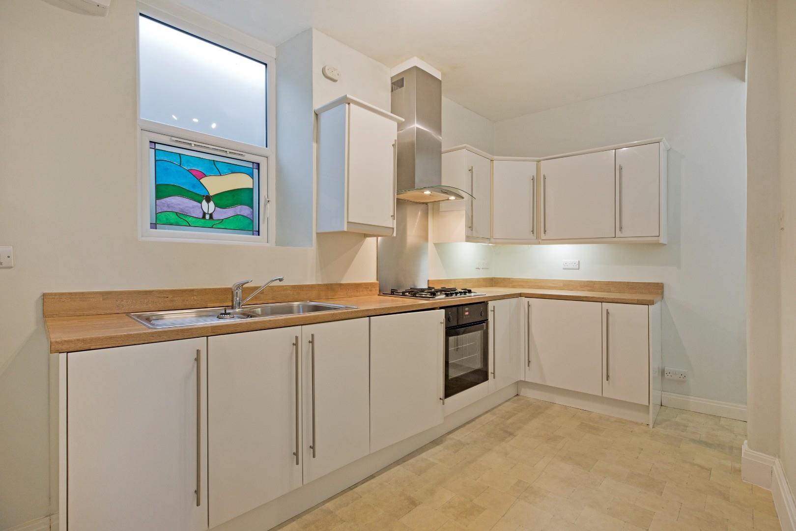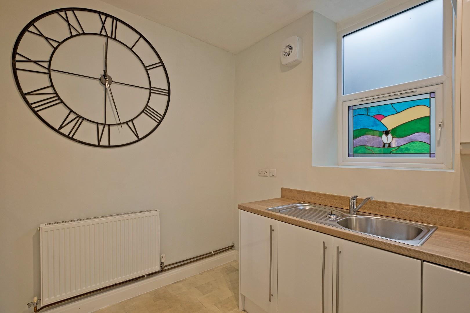 Fitted with a range of high gloss cabinetry with stainless steel handles, complementary worksurfaces and upstands. Appliances include electric oven. five ring gas hob with stainless steel splashback and extractor over, washer dryer and space and plumbing for a fridge freezer. A stainless steel sink and drainer with chrome mixer tap sits beneath a beautiful, stained glass double glazed window to the rear. Tile effect vinyl flooring, radiator, space for a small dining table if required. There is a useful space under the stairs providing further storage.