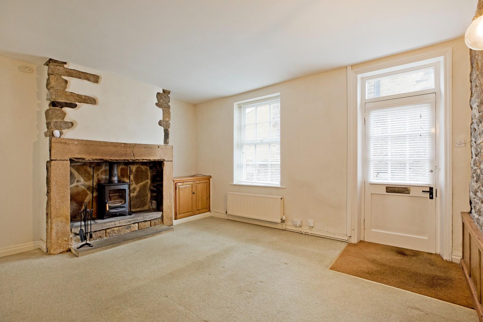 A half glazed timber door opens into a good sized lounge with carpeted flooring, radiator and double glazed window. Wooden wall panelling, attractive, exposed stonework to one wall. Fitted cupboard to one alcove, large, original stone fireplace with stone hearth, housing a multi-fuel stove creating a charming focal point to the room.