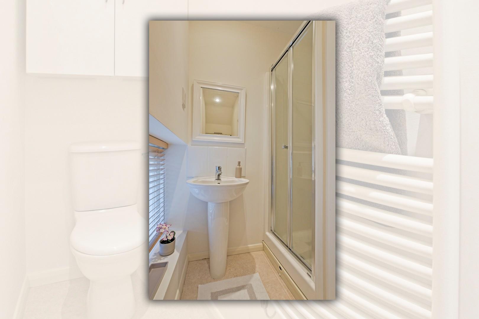 A good sized shower room with low level W.C., pedestal handbasin with chrome mixer tap and tiled splashback and shower cubicle with thermostatic shower and glazed screen. Low level window allowing natural light, vinyl flooring, wall mounted vanity cupboard, white, ladder style heated towel rail.