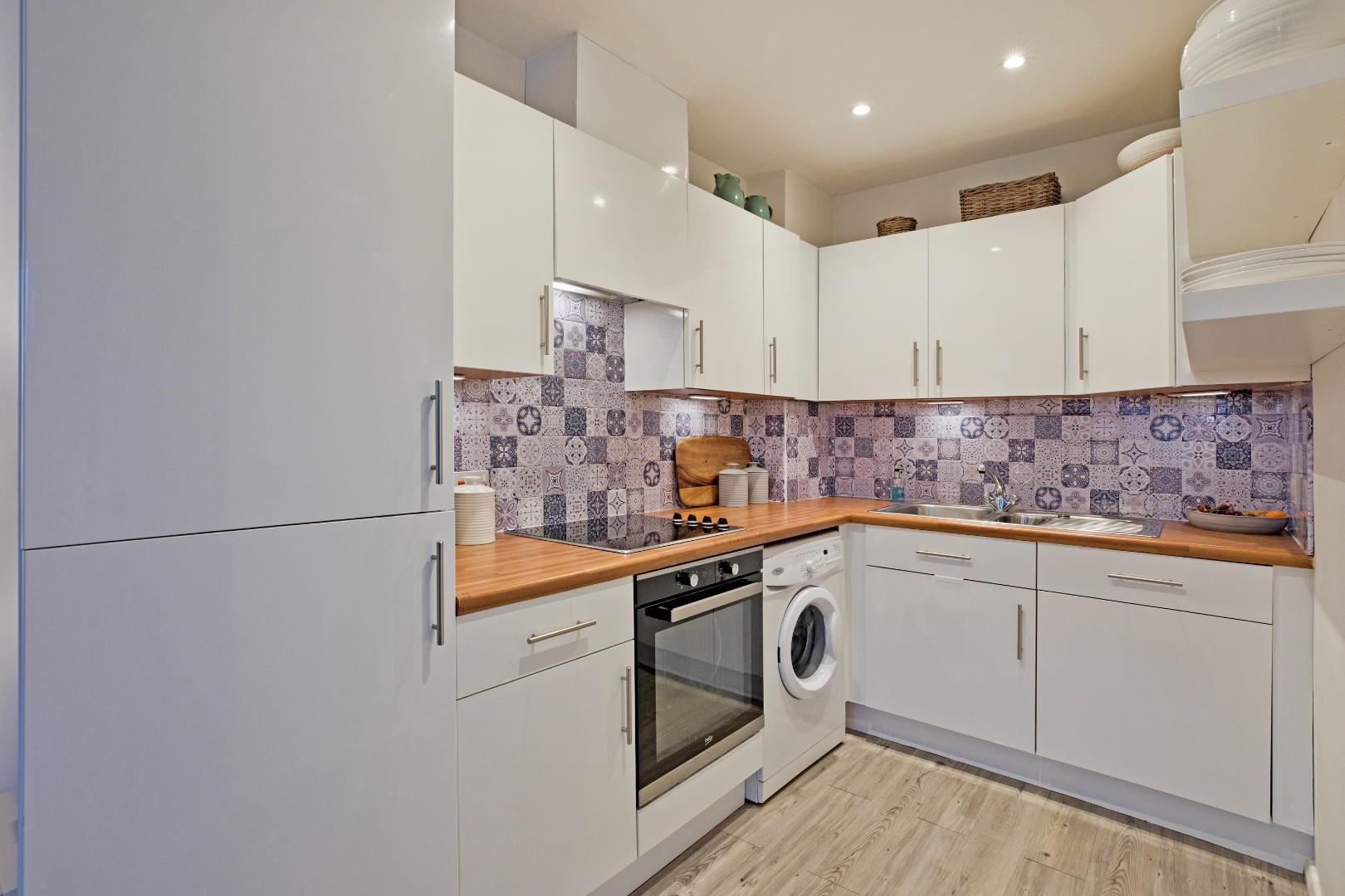 Very well presented with a range of white, high gloss cabinetry with under cabinet lighting, stainless steel handles, wood effect worksurfaces and attractive patterned tiles to splashbacks. Appliances include electric oven, four ring electric hob with extractor over, dishwasher, fridge freezer and washing machine. Downlighting, wood effect laminate flooring, wall shelves.