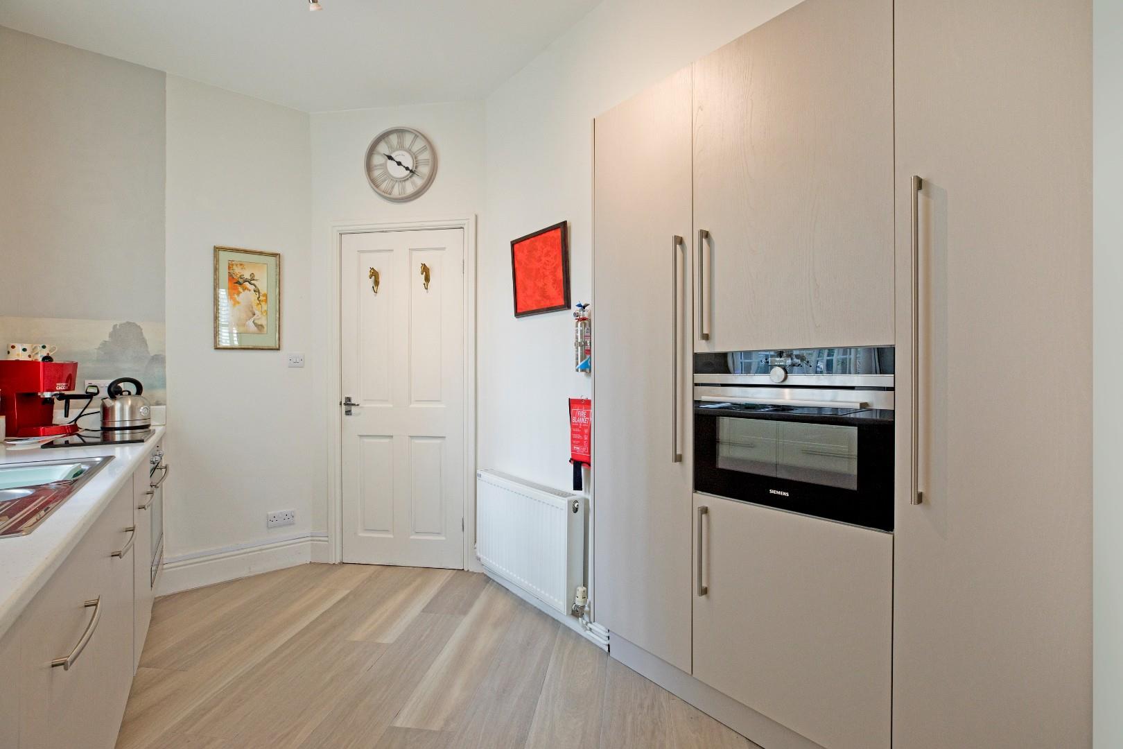 Fitted with a range of soft grey cabinetry with complementary worksurfaces incorporating a small breakfast bar with upstands and attractive tiling to splashback. Appliances include electric oven, four ring hob, fridge freezer, dishwasher and microwave. A stainless steel sink and drainer with chrome mixer tap sits beneath a double glazed window to the side elevation. Continuation of the wood effect flooring, radiator, door to hallway.