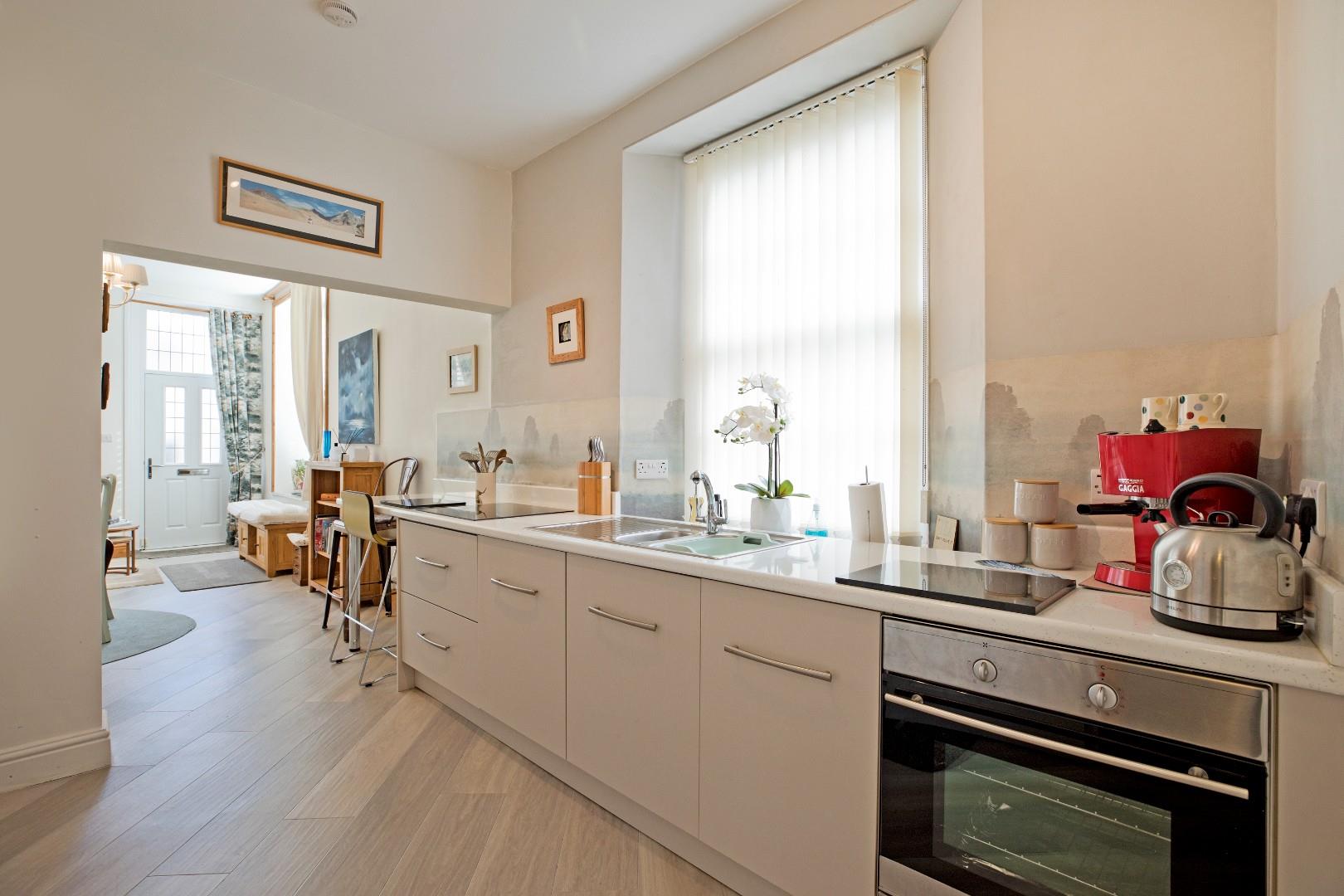 On the ground floor one finds a delightful, spacious open plan living area with dual aspect lounge leading to a very well presented, recently fitted kitchen with a range of integrated appliances. A carpeted staircase leads to the lower ground floor where there is a most useful utility room with storeroom off. A cloakroom/W.C. and rear hallway complete the accommodation on this floor. On the first floor one finds a dual aspect, double bedroom, currently arranged as a lounge, and a beautiful, four-piece house bathroom. To the second floor there are two good sized rooms, one providing excellent storage with exposed beams, and the other is a lovely double bedroom to the rear with exposed beam and stonework. Outside there is parking to the rear with a stone pathway leading to the rear entrance door.