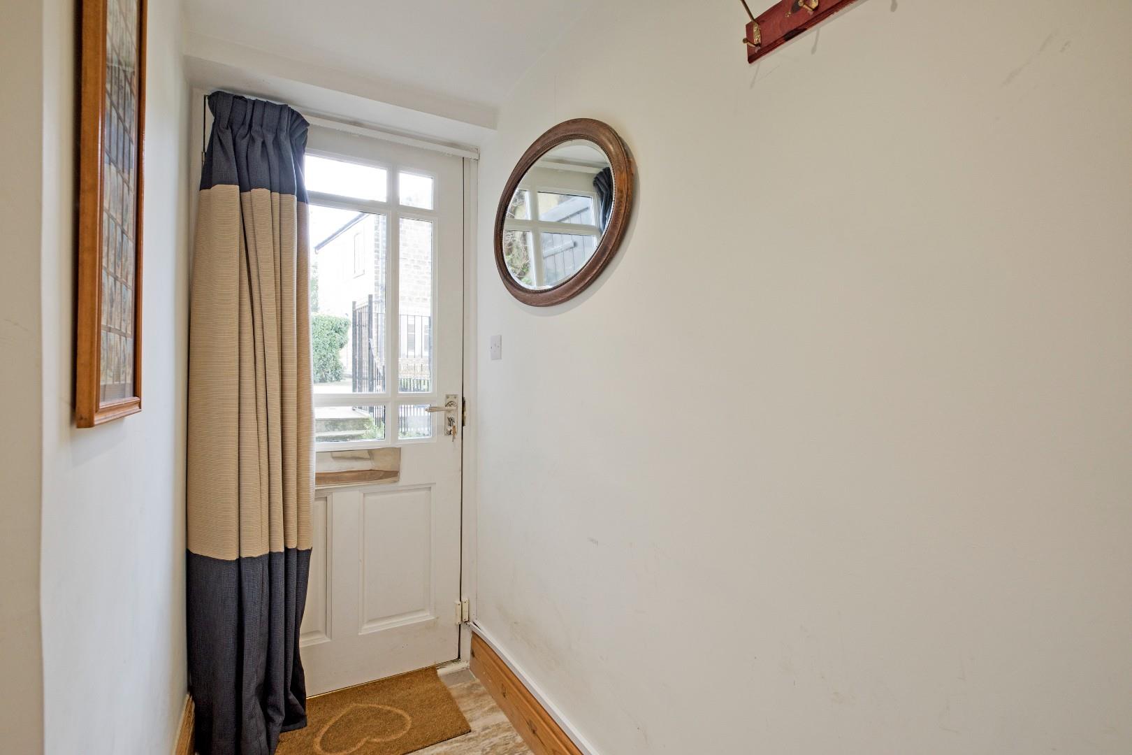 With tiled flooring, radiator and hooks for coats, A half glazed timber door leads to the rear of the property. Downlighting, a carpeted staircase to leads to the first floor. Door into: