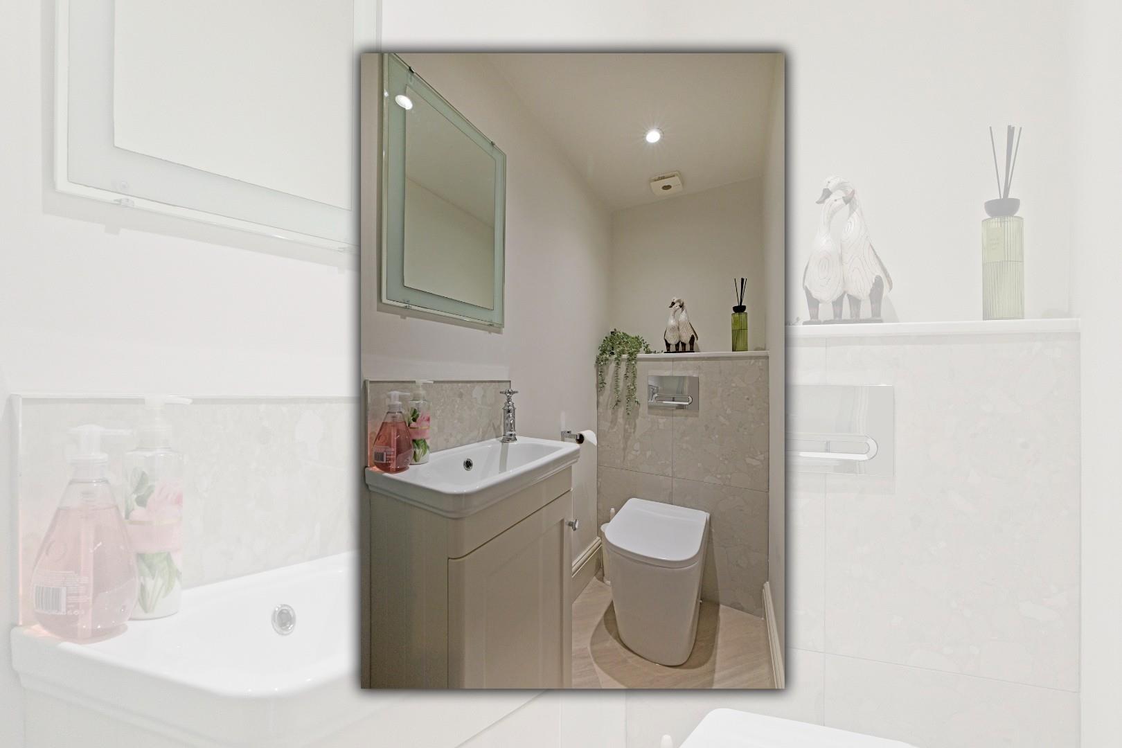 Beautifully presented with low level W.C with concealed cistern, handbasin with chrome tap set in a bespoke vanity cupboard and attractive wall tiling. Wood effect vinyl flooring, downlighting, extractor.