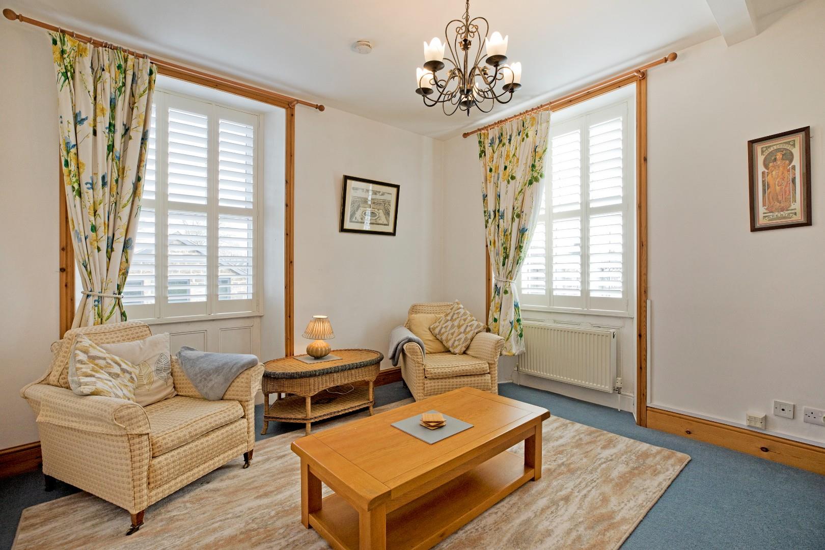 A lovely, light and airy dual aspect room enjoying village views, currently arranged as a lounge with carpeted flooring and radiator. Double glazed windows with attractive plantation shutters.