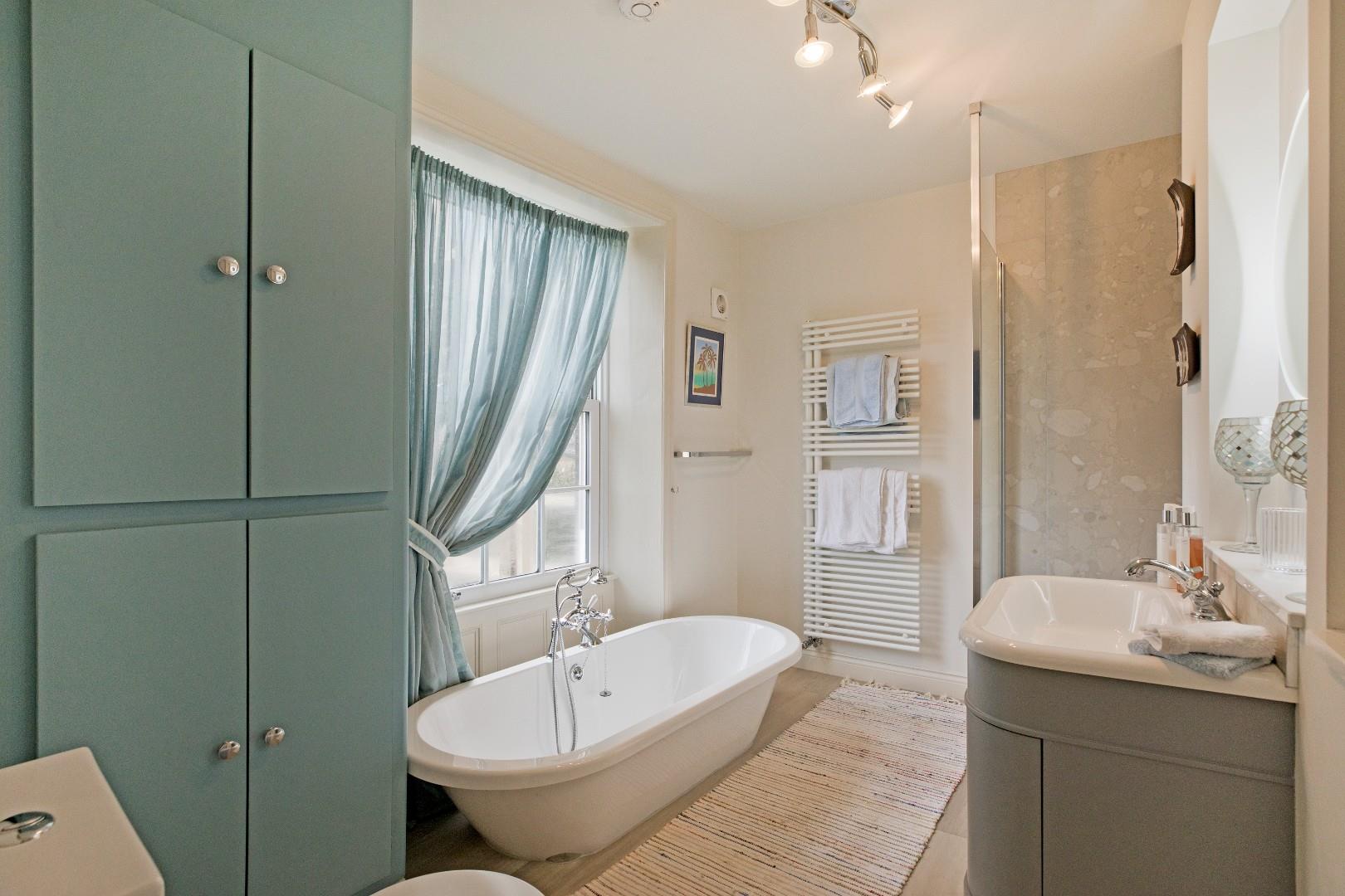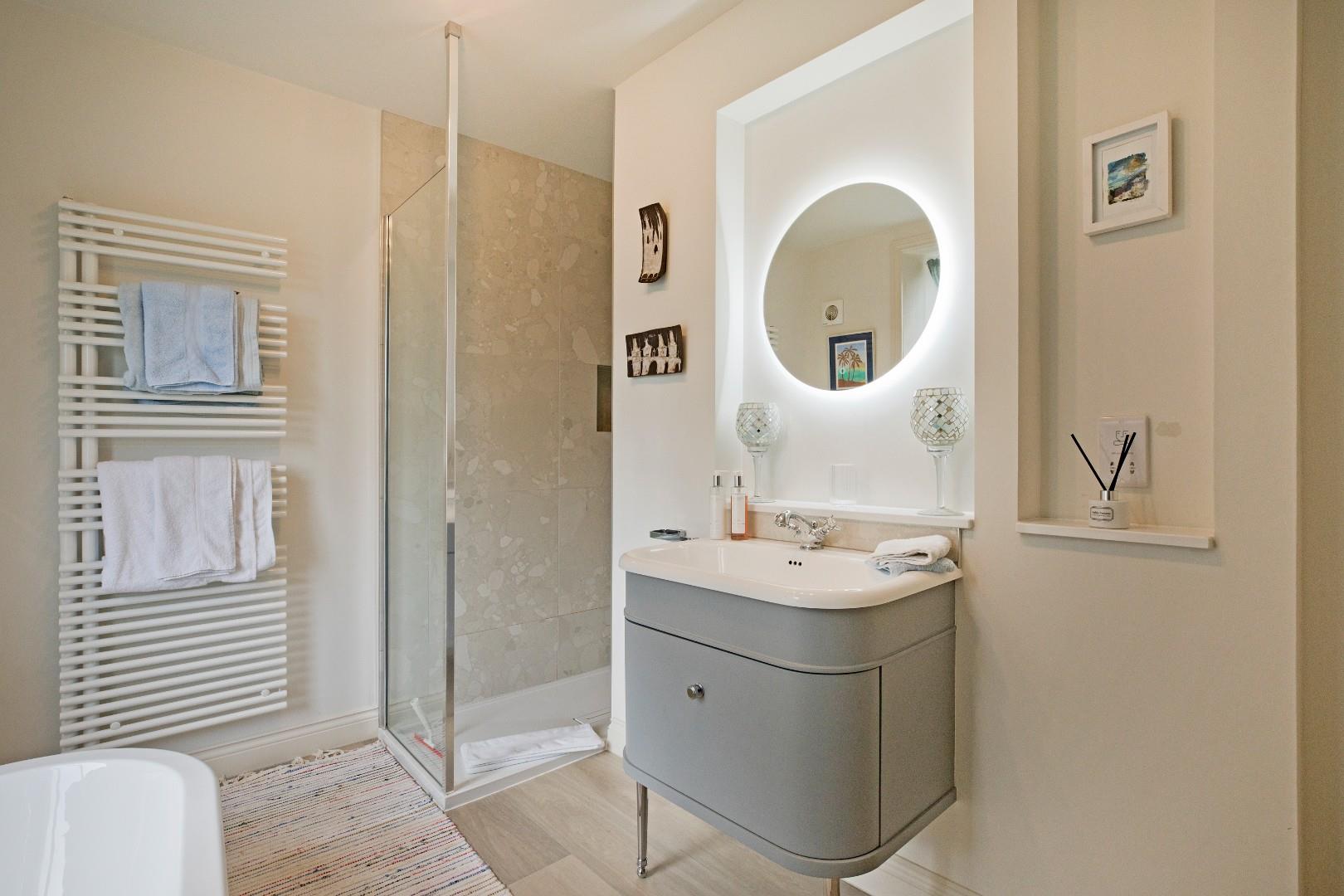 A fantastic, four-piece house bathroom with low level W.C., handbasin with chrome mixer tap set in a bespoke vanity unit and deep-fill bath with telephone style shower attachment. Separate, walk-in shower with thermostatic drench shower with attractive wall tiling and fixed, glazed screen. Wood effect flooring, double glazed window, white, ladder style heated towel rail, extractor.