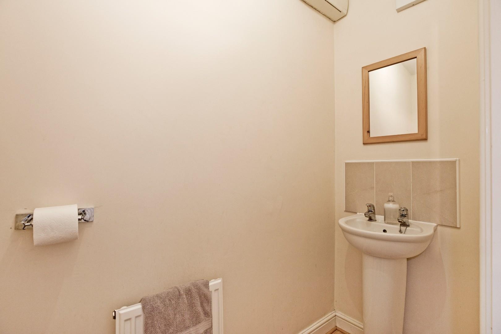 With low-level W.C. and pedestal handbasin with chrome taps and tiled splashback. Continuation of the laminate flooring, radiator, extractor.