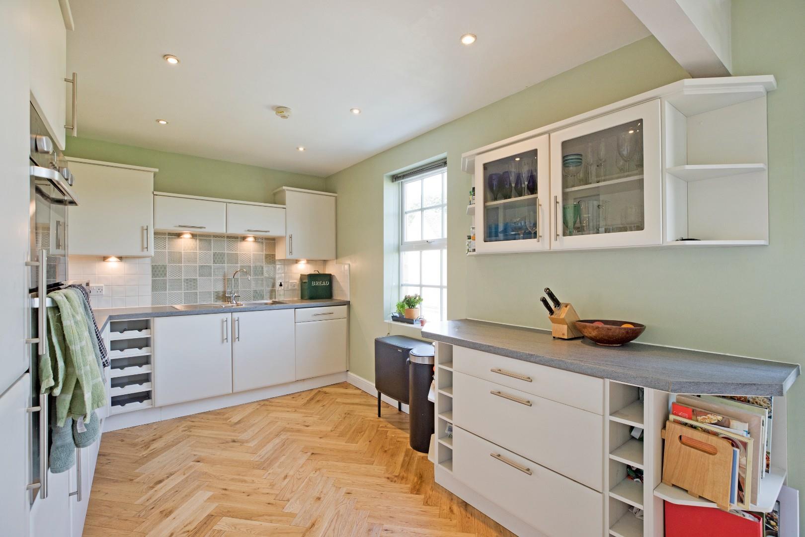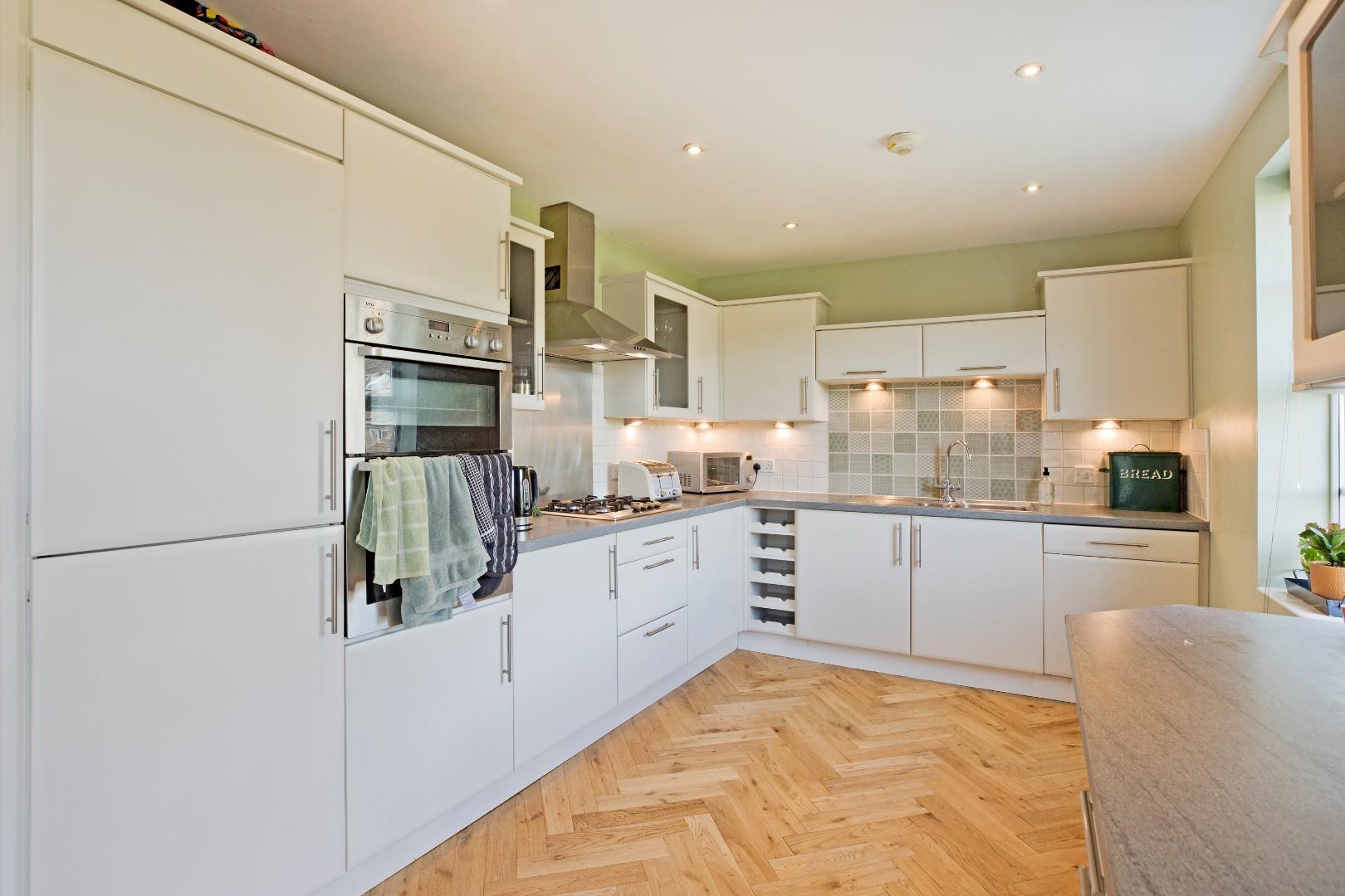 A very well presented, modern dining kitchen to the rear of the property with double glazed window enjoying beautiful leafy views and recently added patio doors with Juliet balcony, affording a delightful aspect over the rear garden and beyond. Fitted with a range of cream base and wall units with stainless steel handles, undercabinet lighting, complementary work surfaces and attractive tiling to splashbacks. Integrated appliances include electric oven and grill, fridge freezer, dishwasher and four ring gas hob with stainless steel splashback and extractor over. Beautiful, solid wood, herringbone style flooring, downlighting, vertical, contemporary style radiator. There is room for a dining table here making this a most sociable space.