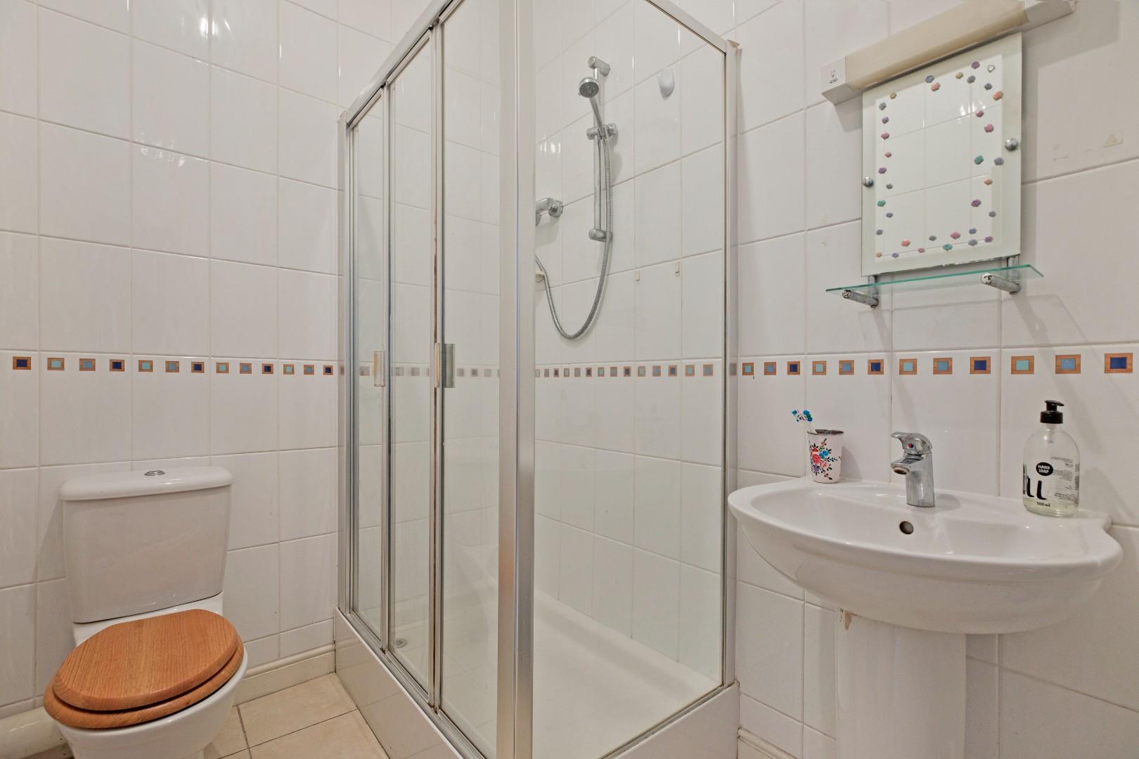 With low-level W.C., pedestal handbasin with chrome mixer tap and separate shower cubicle with thermostatic shower, folding, glazed doors and white wall tiling from floor to ceiling. Complementary floor tiles, chrome, ladder style, heated towel rail ceiling light, extractor.
