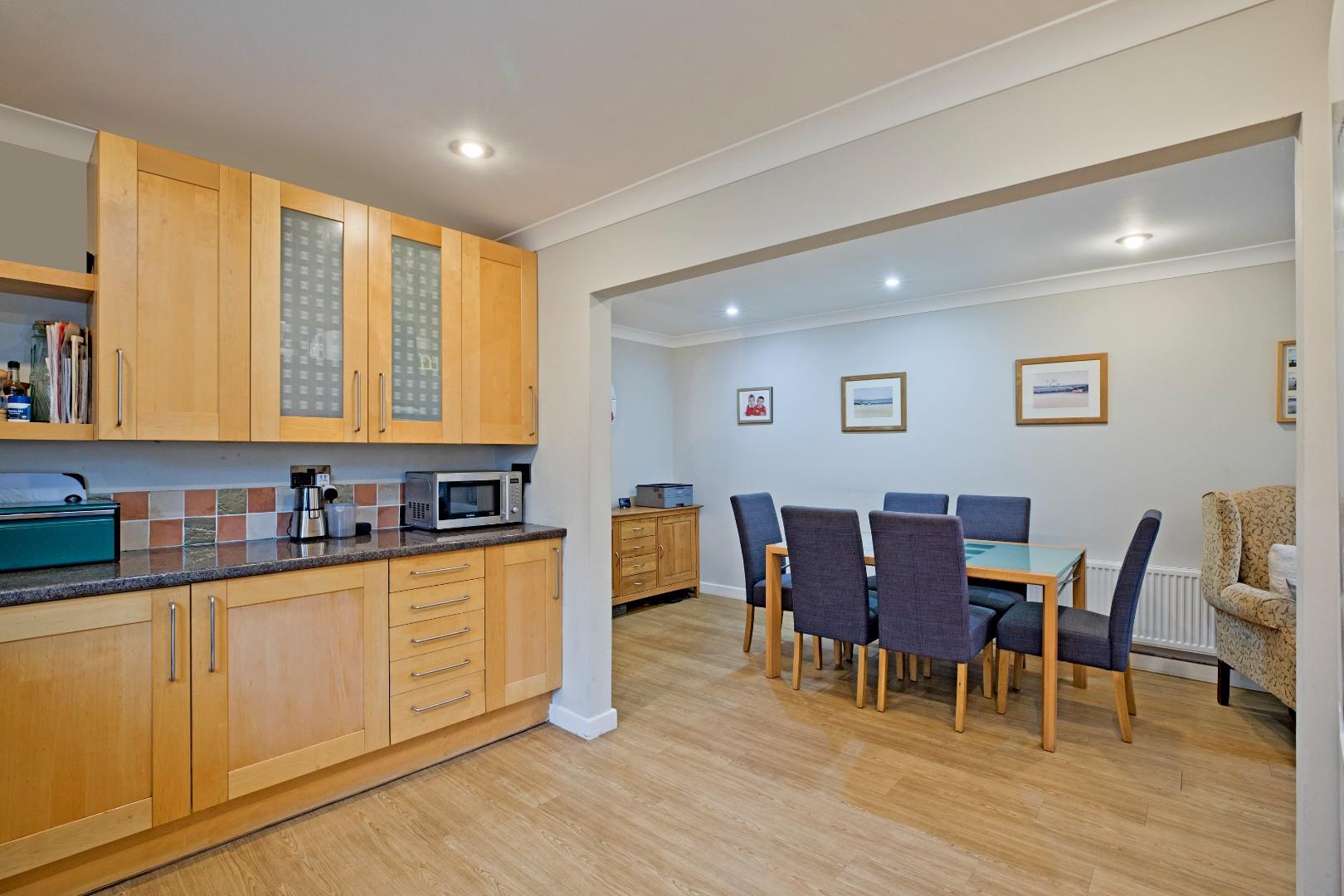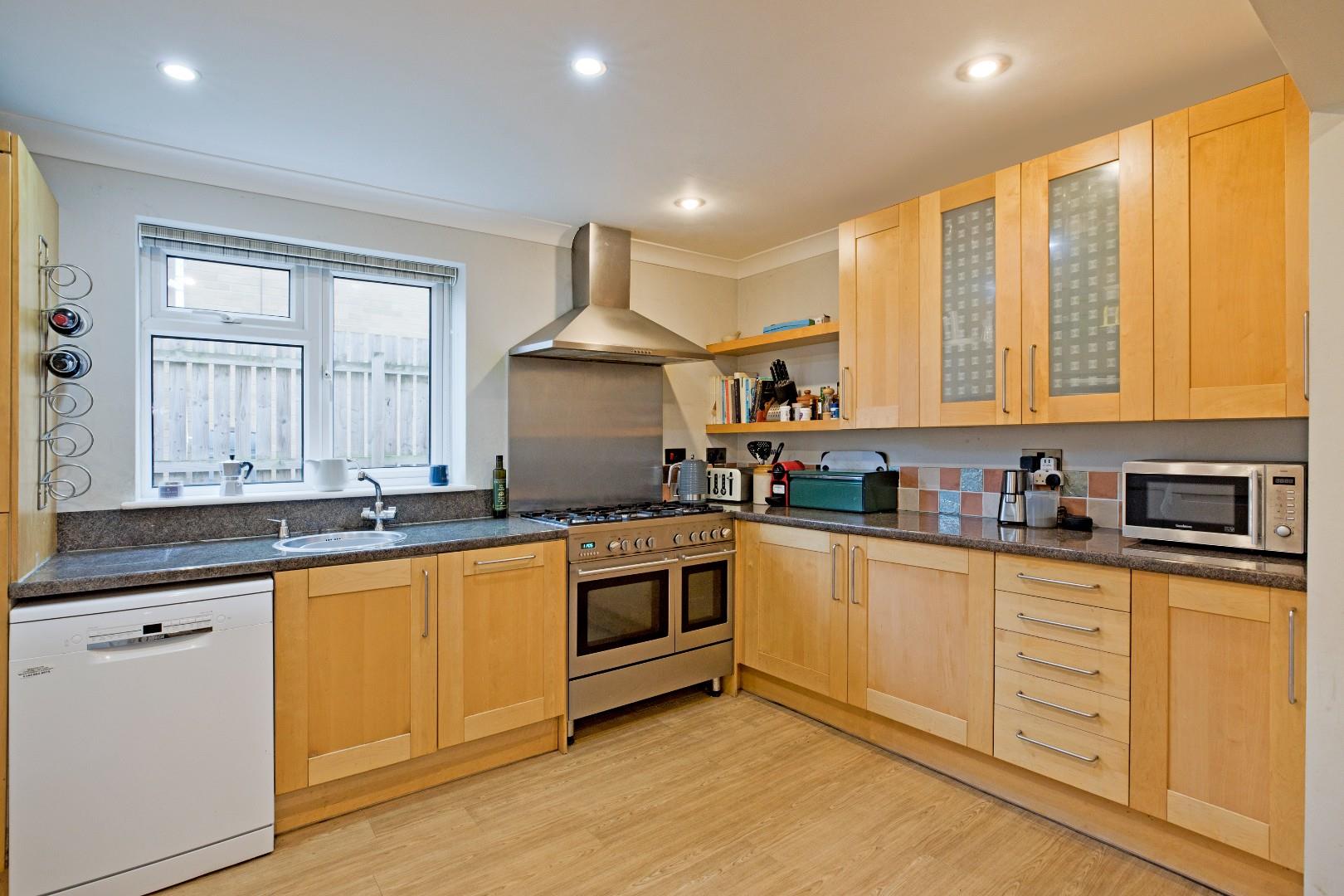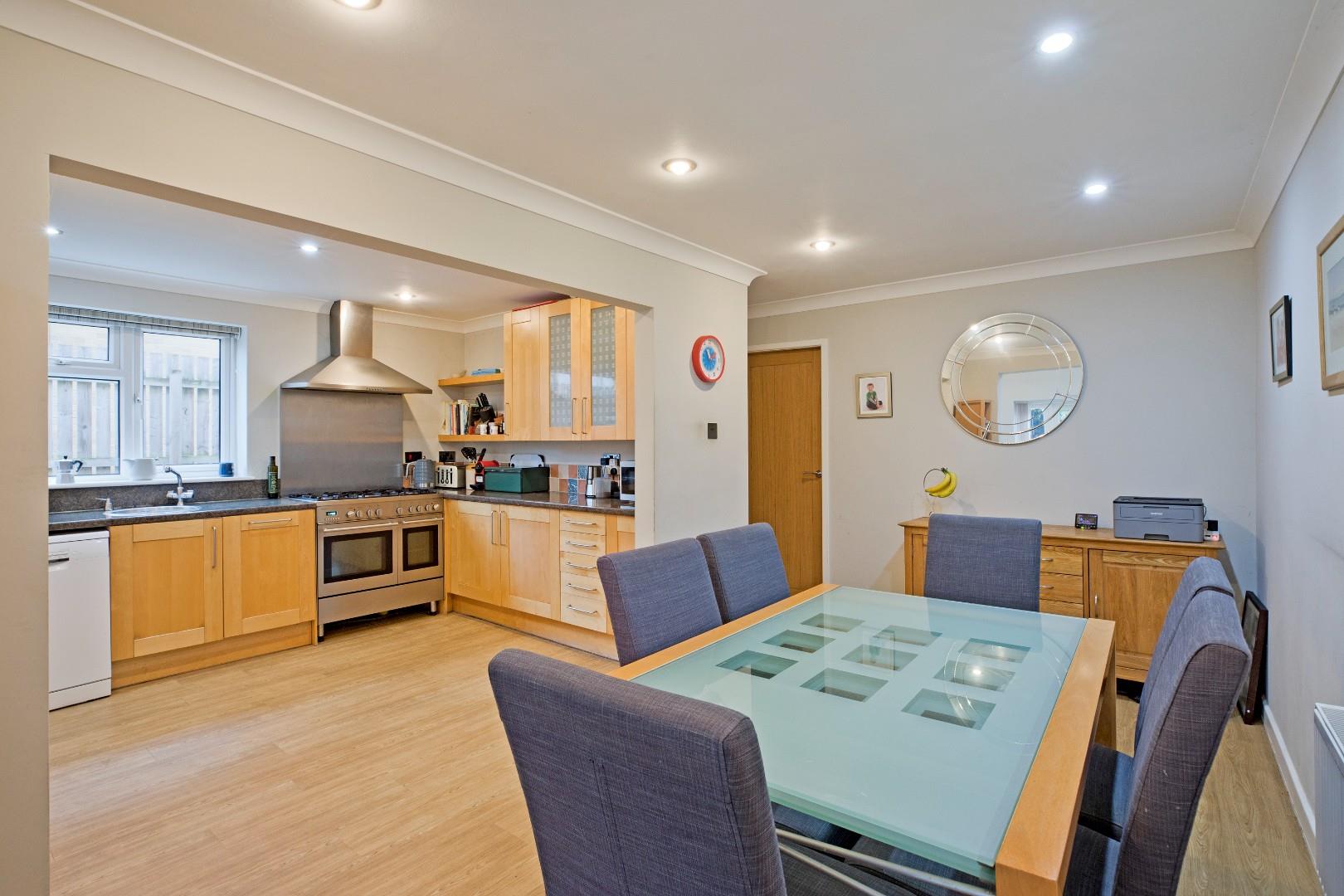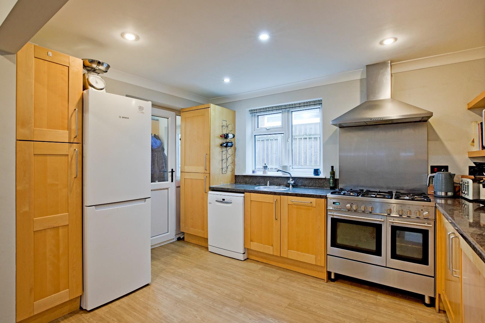 A spacious dining kitchen fitted with a range of modern, wooden fronted base and wall units with complementary laminate worksurface over with matching laminate upstands and coordinating tiled splashback. Stainless-steel double range oven with five burner gas hob over with stainless-steel splashback and chimney hood and extractor. Space for a dishwasher and a fridge/freezer. An inset circular stainless-steel washbasin with monobloc tap sits beneath a large, double glazed window to the side of the property allowing plenty of light to flood in. A cupboard houses the Worcester central heating boiler. Luxury vinyl tile flooring, coving, radiator and downlighting. Ample space for a large, family dining table - a great sociable environment for the family to congregate.