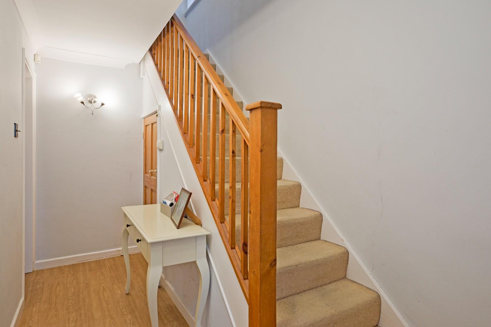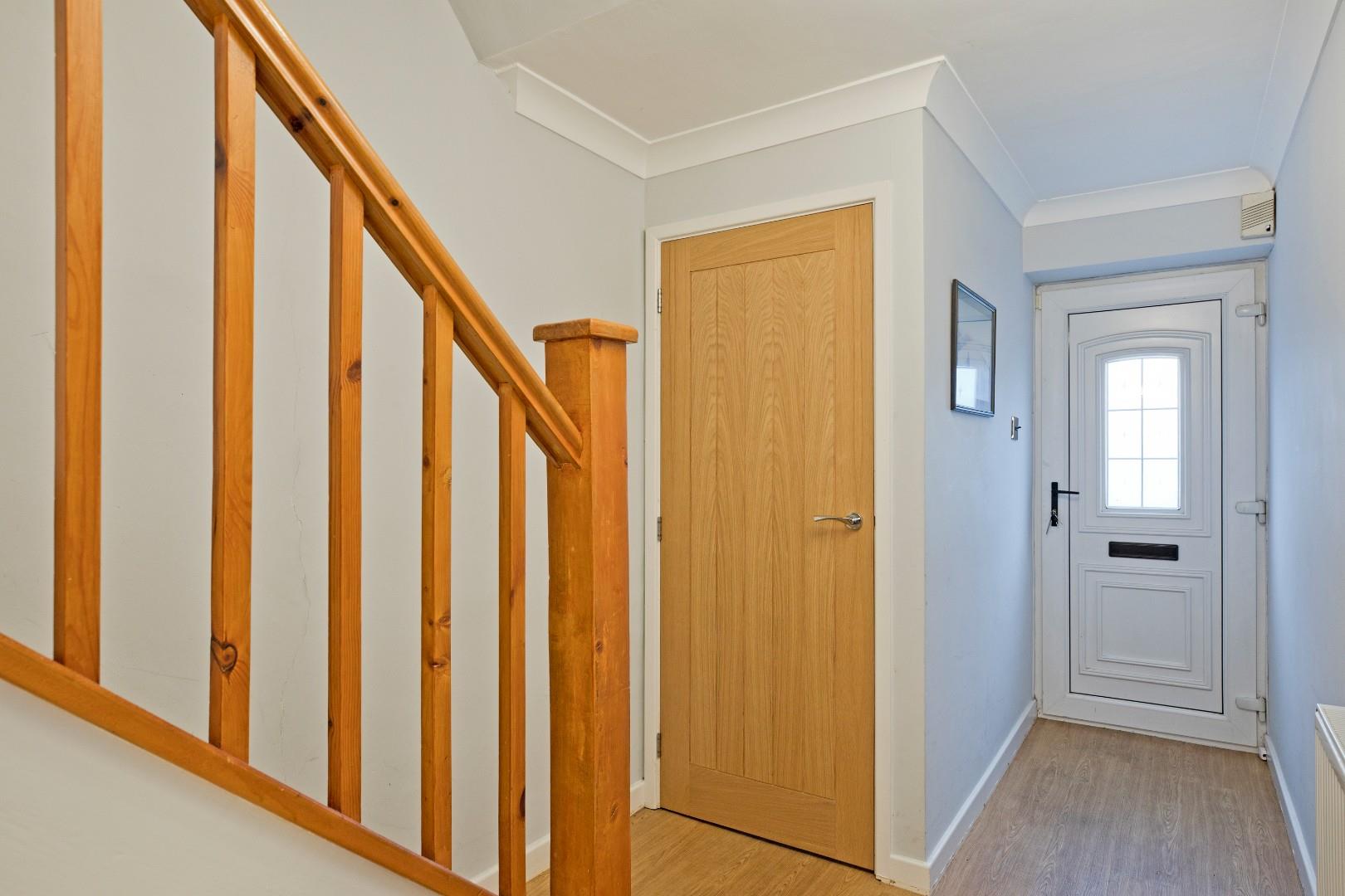 A UPVC entrance door with opaque glazed panel opens into a welcoming hallway with coving, practical, luxury vinyl tile flooring, radiator and wall light. A carpeted, return staircase with open spindle balustrade leads to the first floor. A useful understairs cupboard provides good storage space.
