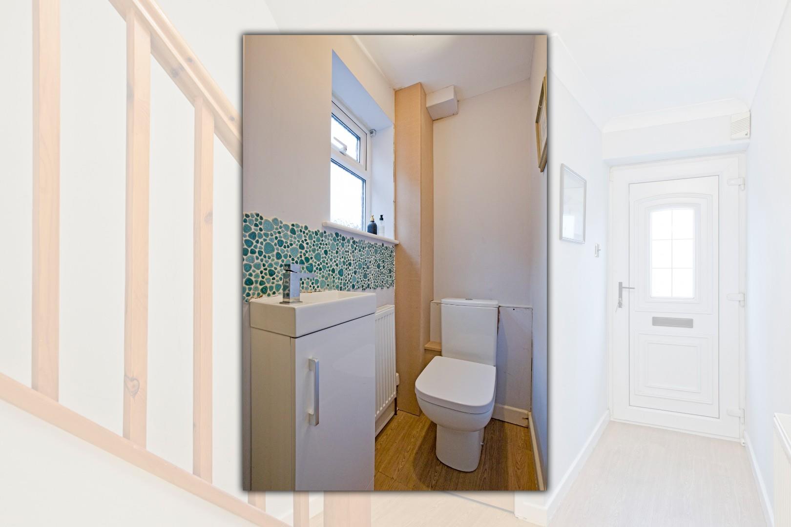 Fitted with a contemporary, rectangular, vanity washbasin with useful cupboard below, monobloc tap and attractive, pebble design, tiled splashback. Low-level w/c. Opaque, glazed side window, laminate flooring and radiator.