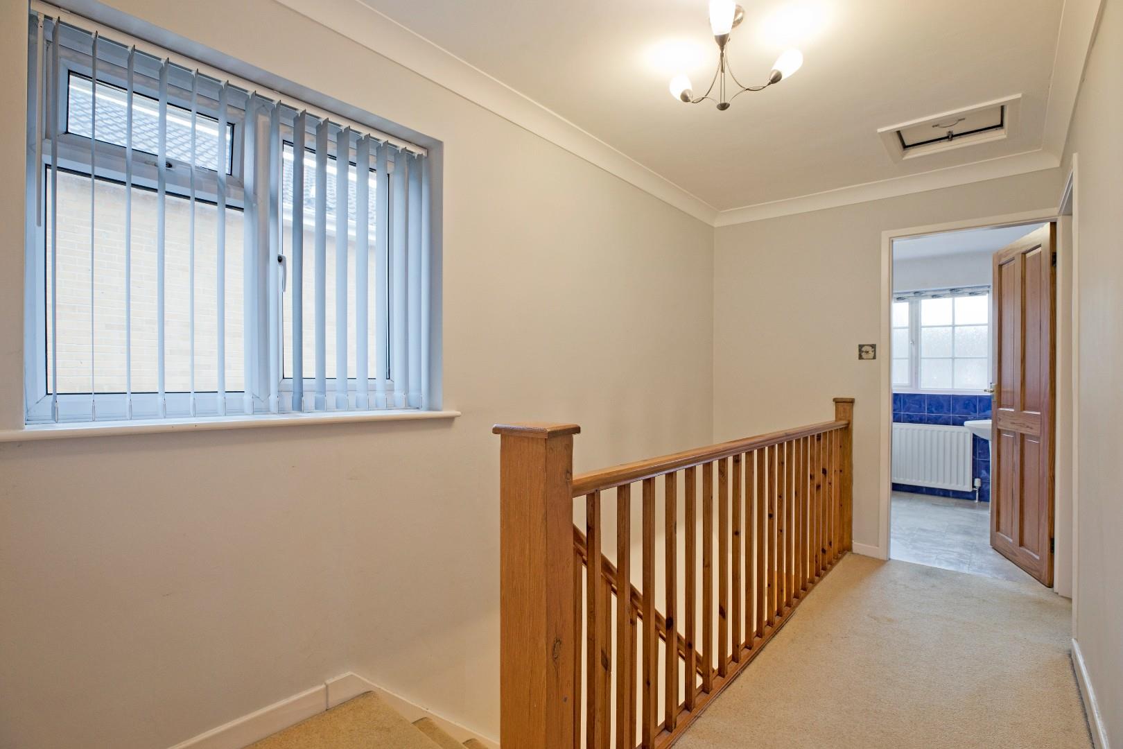 A return carpeted staircase leads up to a good-sized, carpeted landing. Light floods in through a UPVC double-glazed window to the side elevation. Coving and loft hatch.
