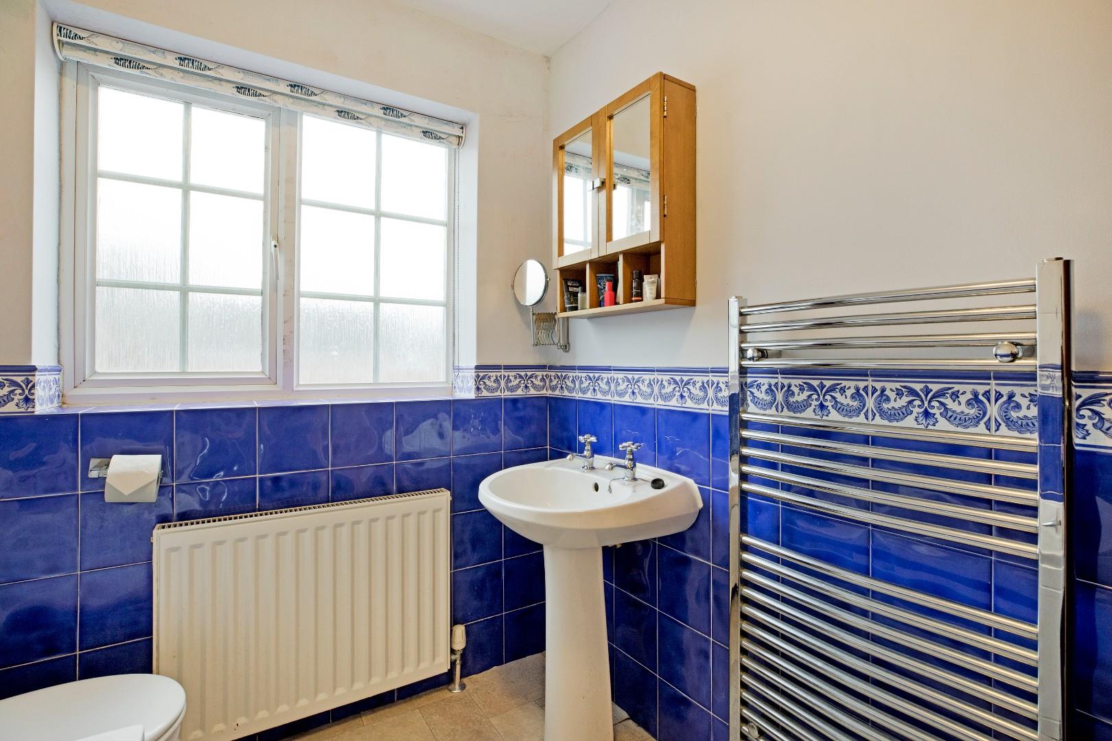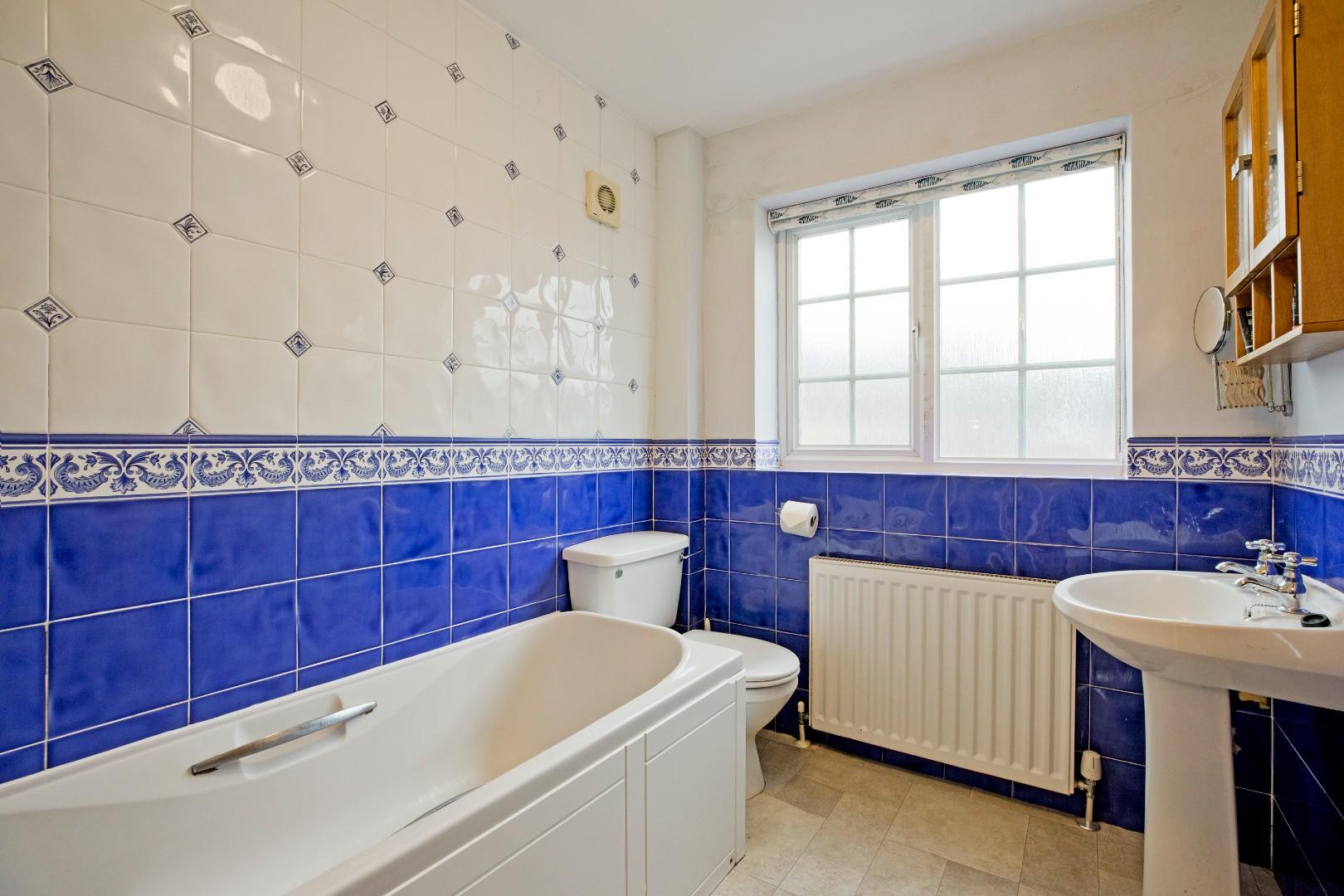A three-piece house bathroom with white suite, comprising of a panel bath with shower over, a pedestal washbasin with traditional style taps and a low-level w/c. Fully tiled around the bath and half tiled elsewhere. A large, UPVC, double-glazed window with opaque glazing allows ample natural light. Vinyl flooring, radiator, chrome ladder towel radiator and extractor fan.