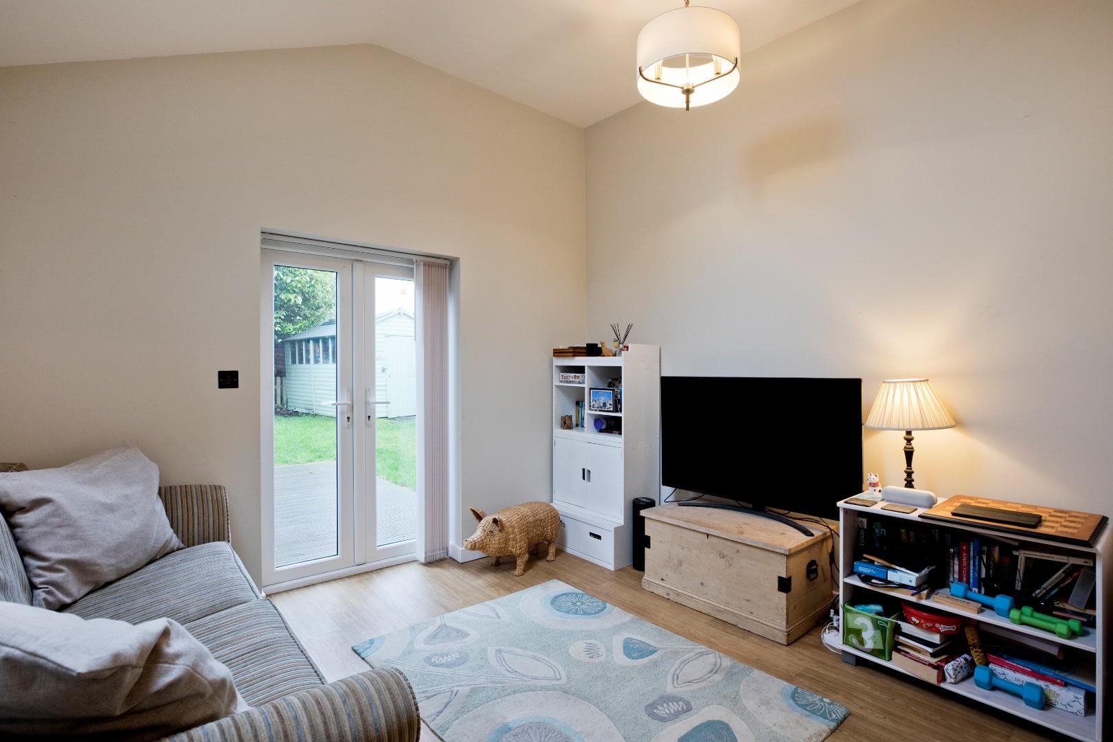 A step down from the dining kitchen leads into this lovely family room with double glazed French doors leading out onto a great-sized, decked, patio area, making this conducive to al fresco dining and entertaining in the warmer months. A Velux window accentuates the bright atmosphere. Continuation of the luxury vinyl tile flooring, radiator and TV point.
