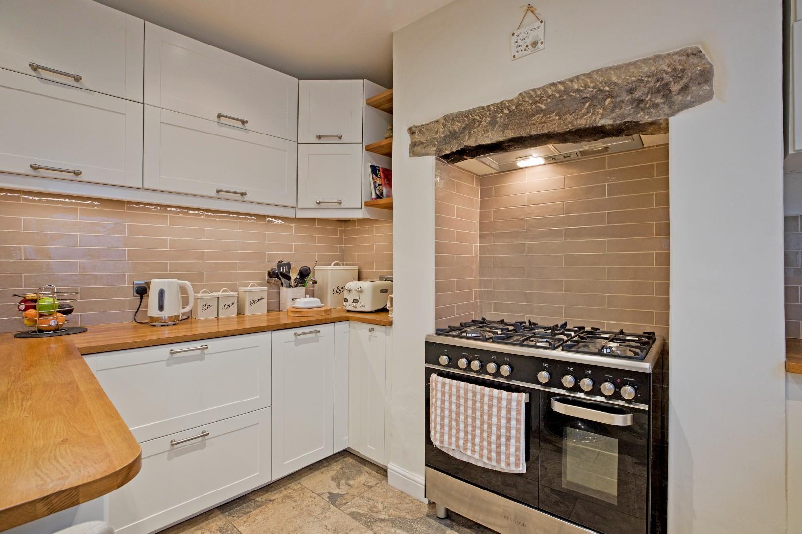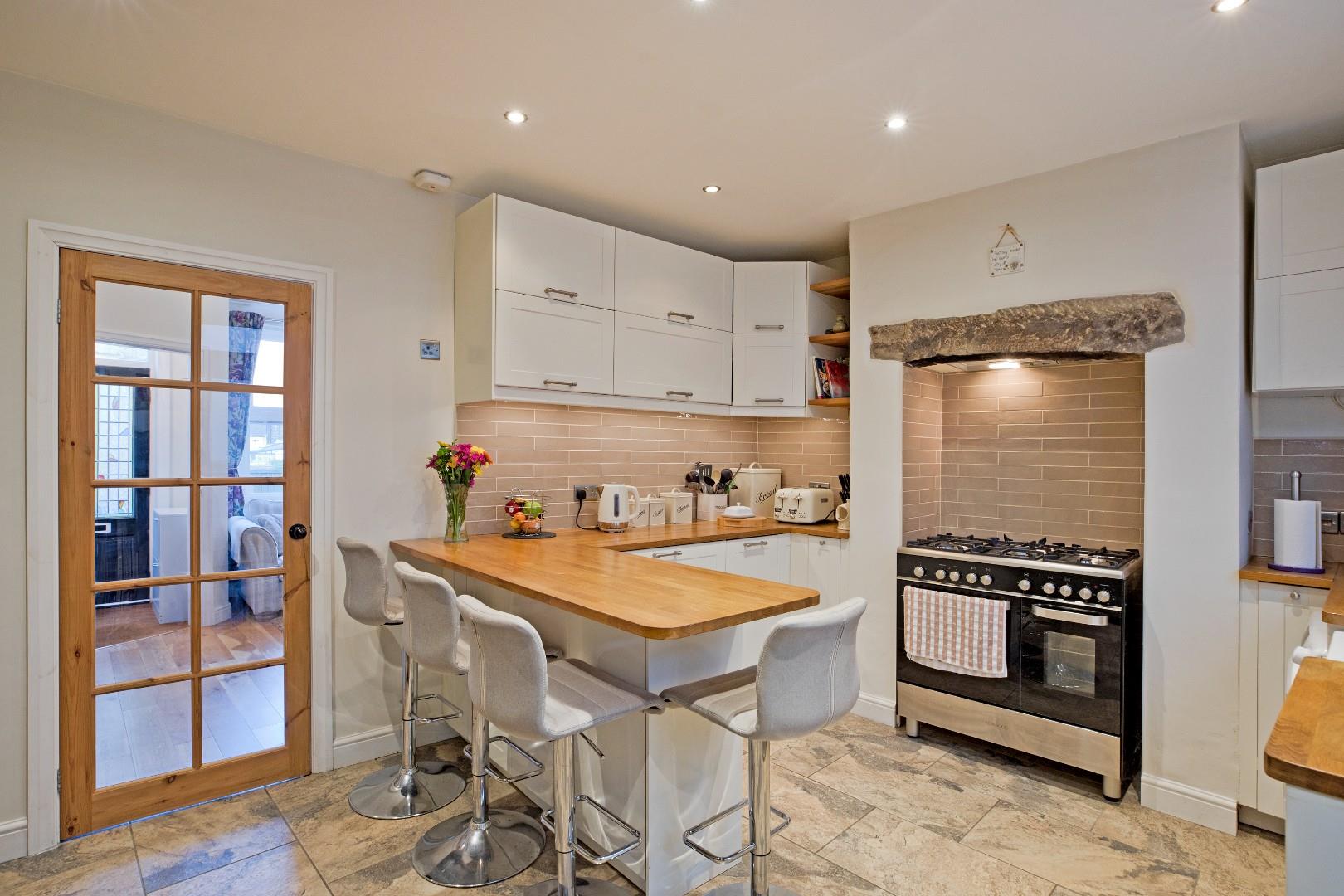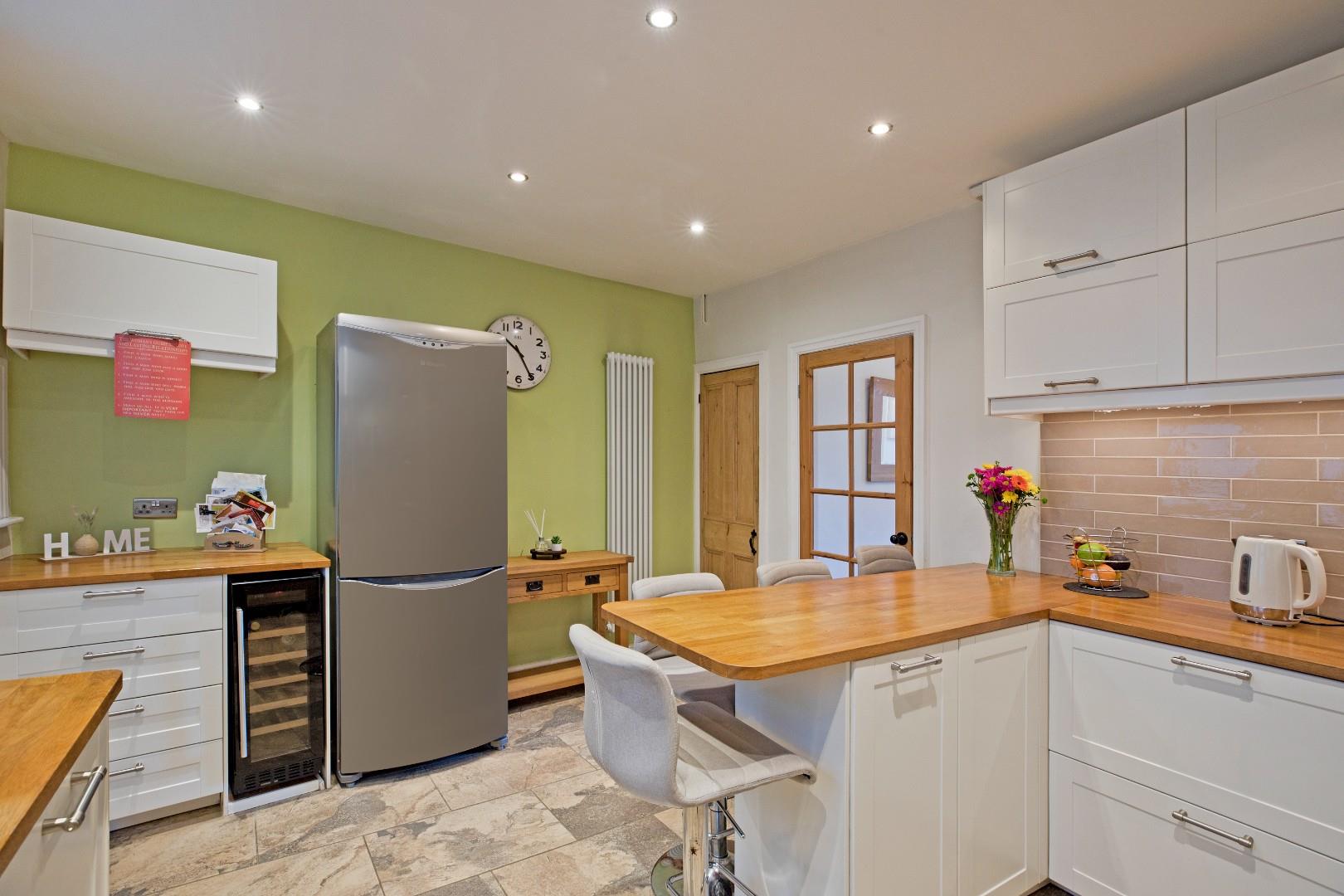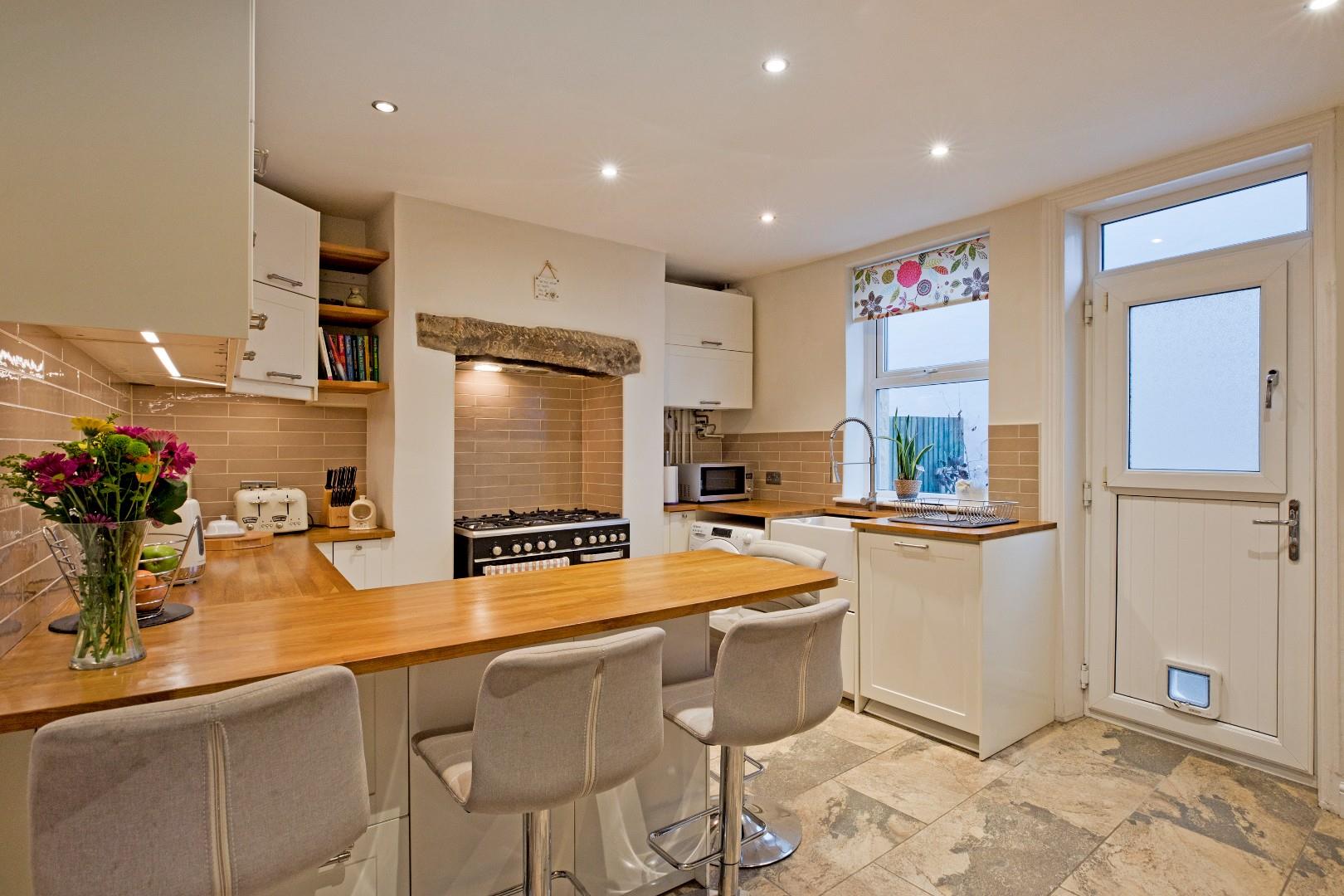 A beautifully presented dining kitchen fitted with a range of cream, Shaker style cabinetry with stainless steel handles, solid wood worksurfaces, incorporating a handy breakfast bar, and attractive tiling to splashbacks. There is a space for a range of appliances, including cooker, which is set in a chimney breast with Metro tiling to splashback with extractor over and original stone lintel, and space and plumbing for a washing machine, dishwasher, fridge freezer and wine fridge. A Belfast style sink with chrome, hose style mixer tap sits beneath a double glazed window looking out over the rear, courtyard garden. Stone flooring, recessed ceiling lights, contemporary styled, vertical radiator. A half glazed, uPVC stable door leads out to the rear. A useful under stairs cupboard provides excellent storage.