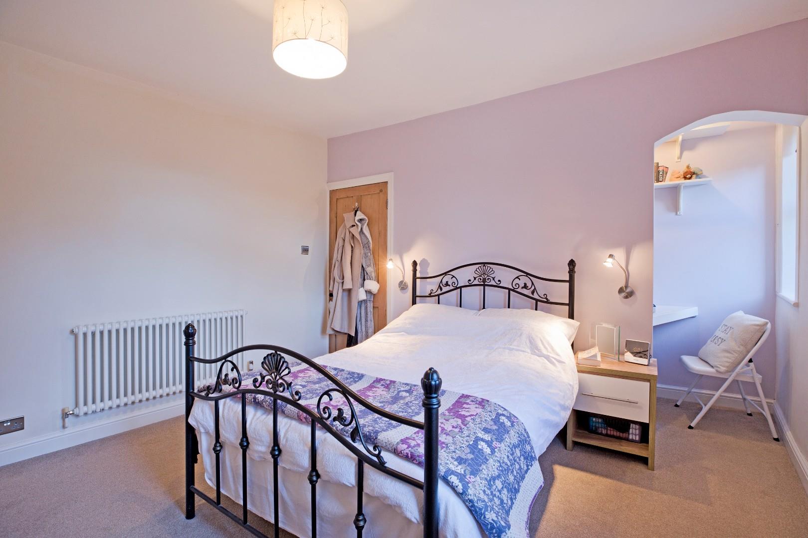 A good sized double bedroom to the front of the house with fitted wardrobes, carpeted flooring, traditional style radiator and two double glazed windows. There is a useful corner with fitted desk and shelving, ideal as a vanity area or small home office.