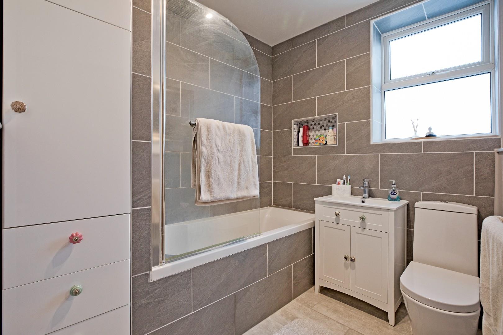 A very well presented, three-piece house bathroom with low-level W.C., handbasin with chrome mixer tap set in a bespoke vanity unit and bath with thermostatic drench shower plus additional shower attachment, glazed screen and smart grey wall tiling. Complementary floor tiles, traditional style, heated towel rail, wooden panelling to half height. Recessed storage cupboard and drawers, ceiling lights, obscure, double glazed window.
