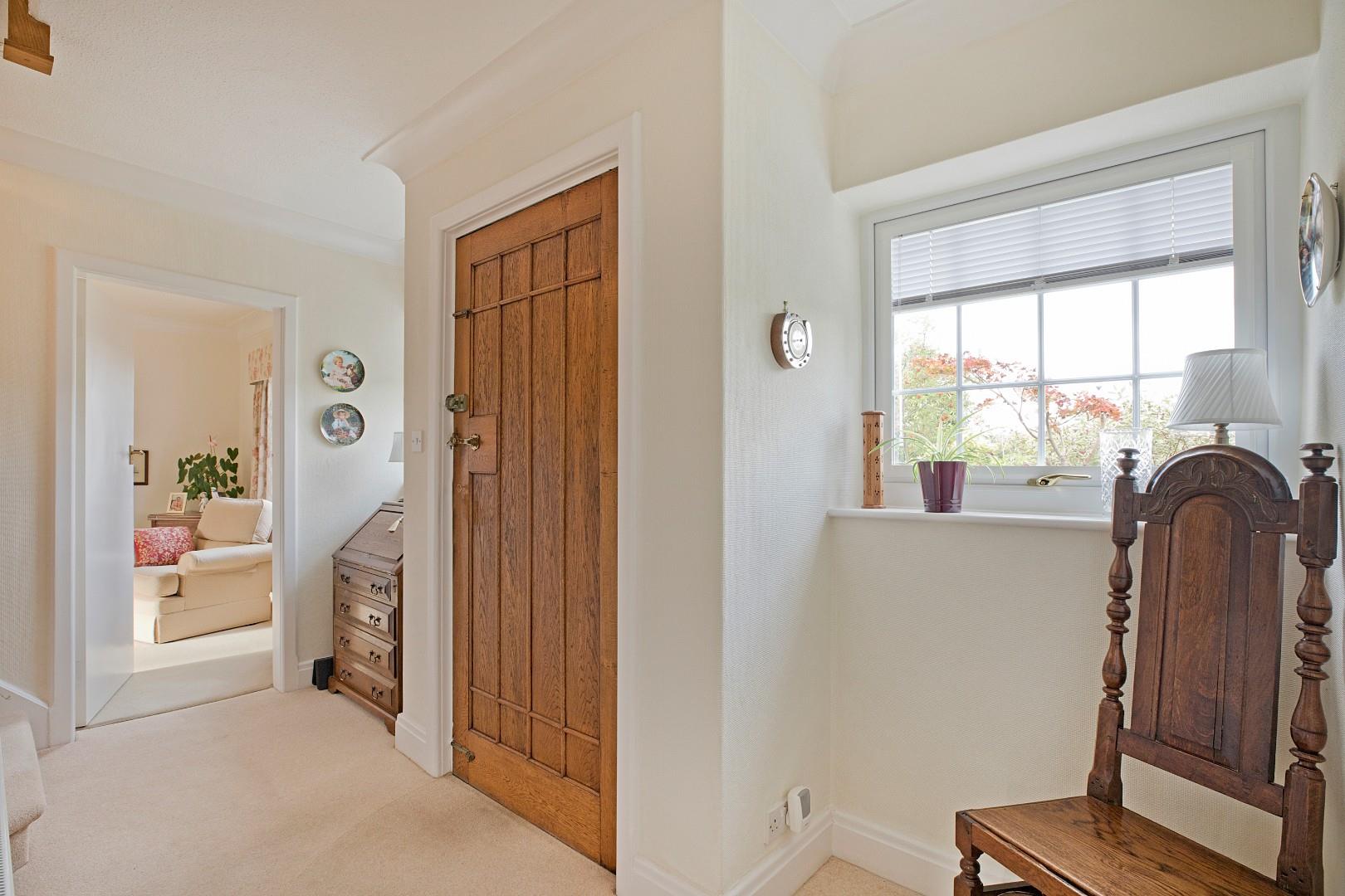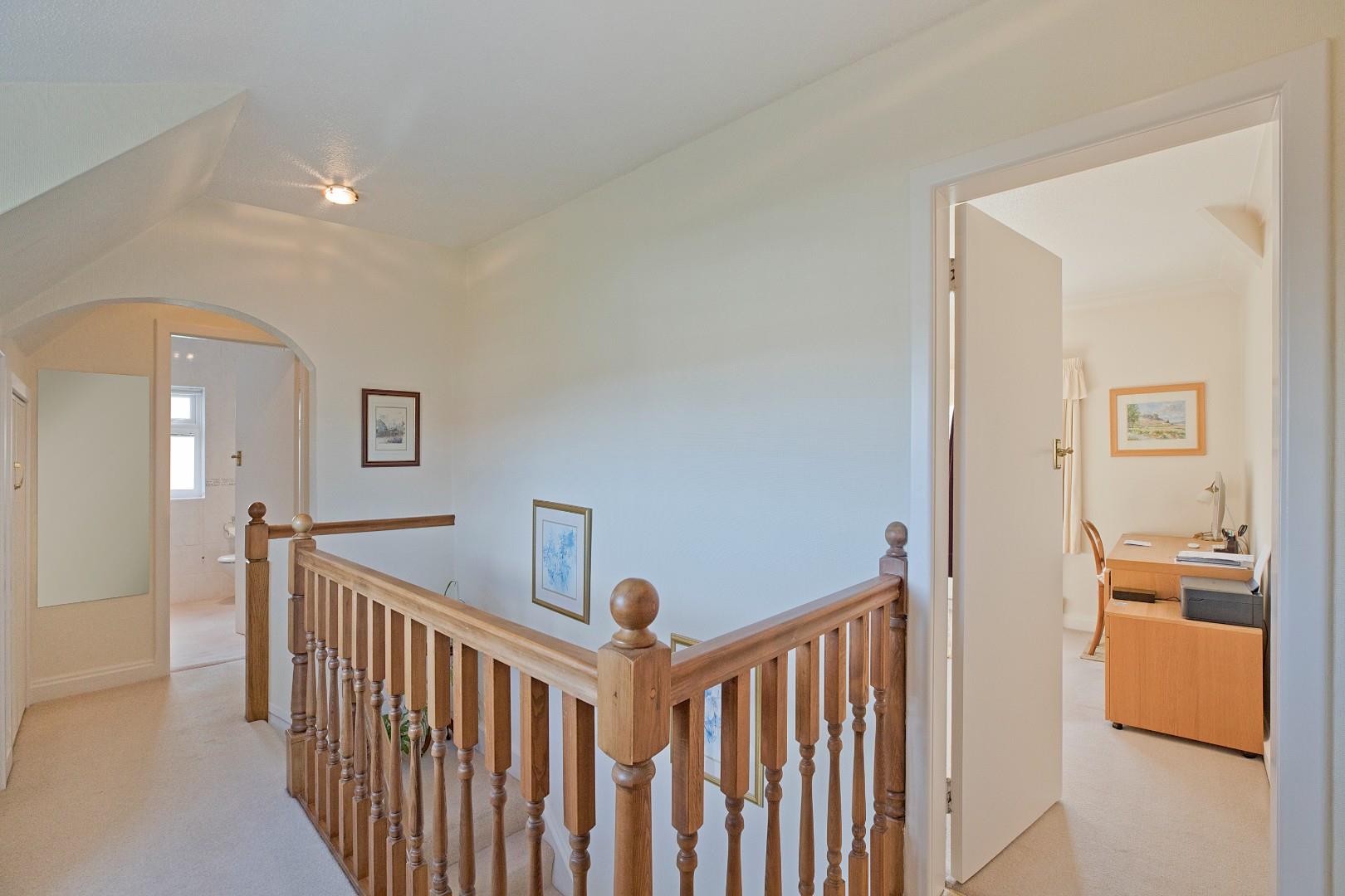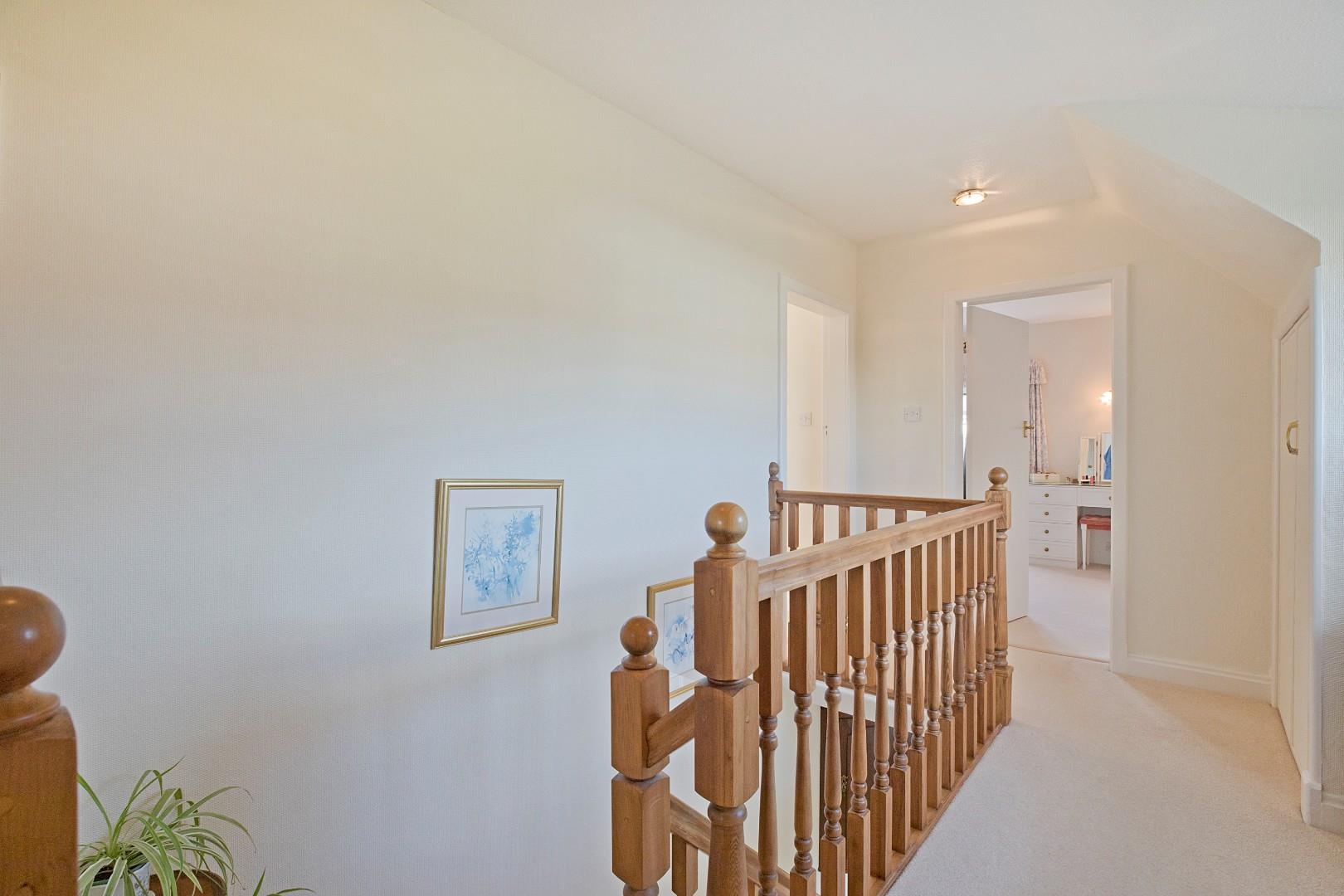 A return, carpeted staircase with attractive, oak balustrade leads up to the first floor landing. A double glazed window to the front elevation affords lovely views across to the moor. Three recessed cupboards with hanging rails and shelves provide useful storage. Doors open into three bedrooms and the house bathroom.