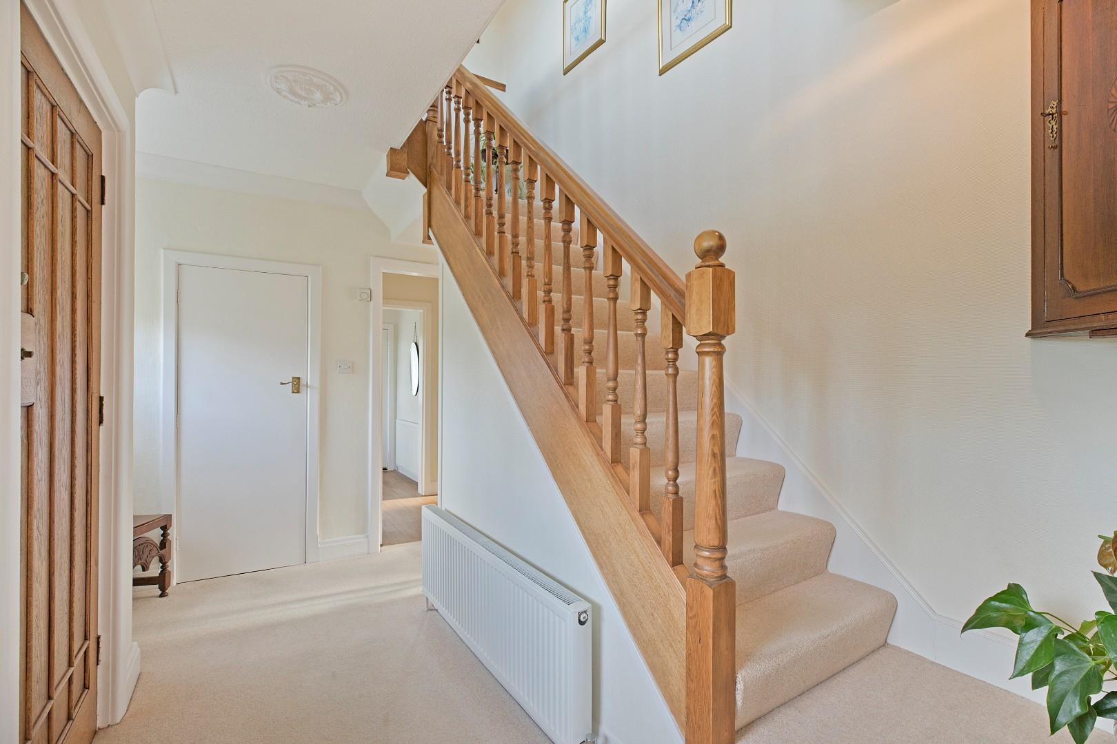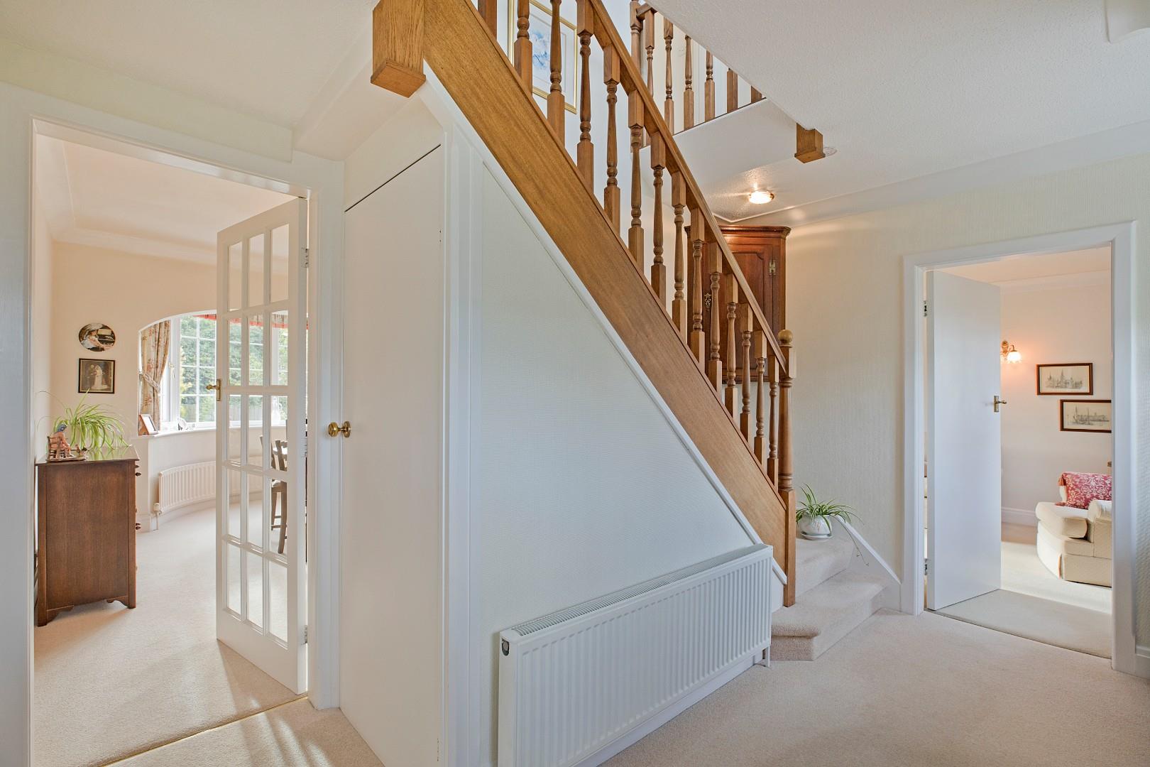 A beautiful, solid oak, curved entrance door with double glazed windows to either side opens into a welcoming hallway with carpeted flooring, coving and radiator. Doors open into the lounge, dining room, shower room and inner hallway leading in turn to the kitchen, home office area and rear porch. Useful under stairs cupboard. A return, carpeted staircase with beautiful, oak balustrading leads up to the first floor landing.
