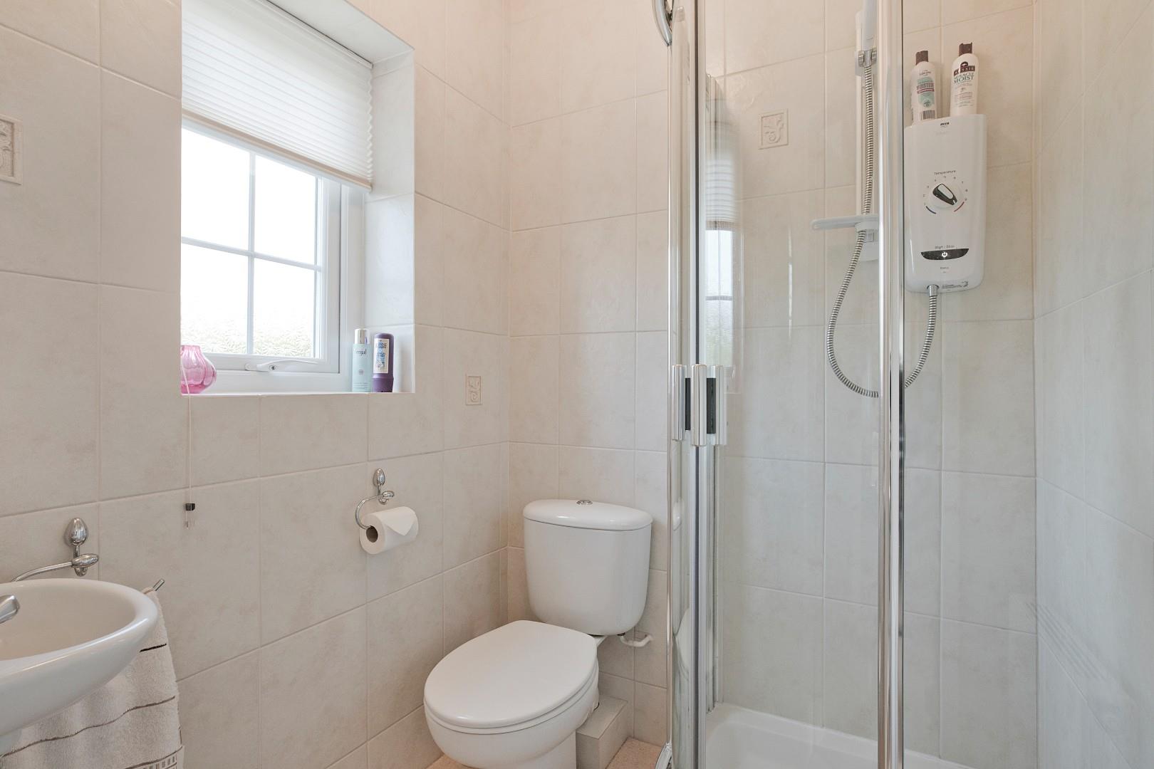 With low level w/c, wall hung hand basin with chrome taps and separate shower cubicle with electric shower. Neutral wall tiling, obscure, double glazed window, carpeted flooring, radiator.