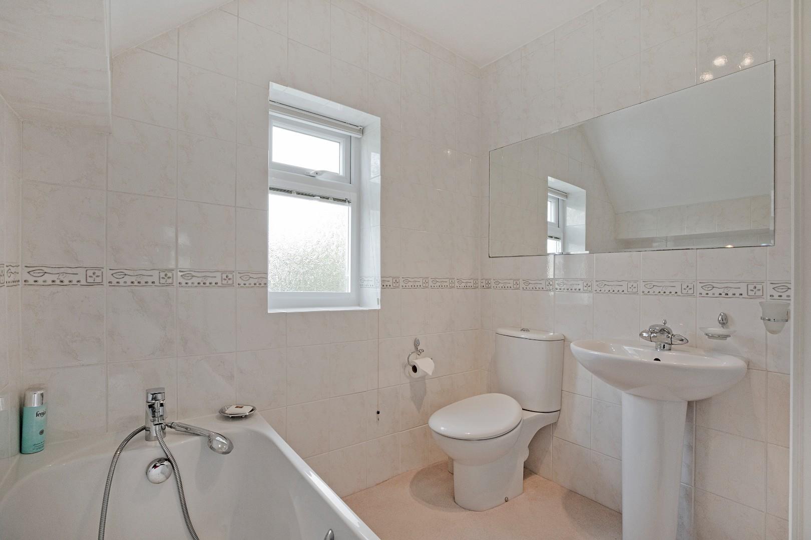 With low level w/c, pedestal hand basin with chrome, mixer tap and bath with tiled side and mixer tap with shower attachment. Neutral wall tiling and radiator. Cupboard housing the hot water tank. Carpeted flooring, wall mirror, obscure glazed window.
