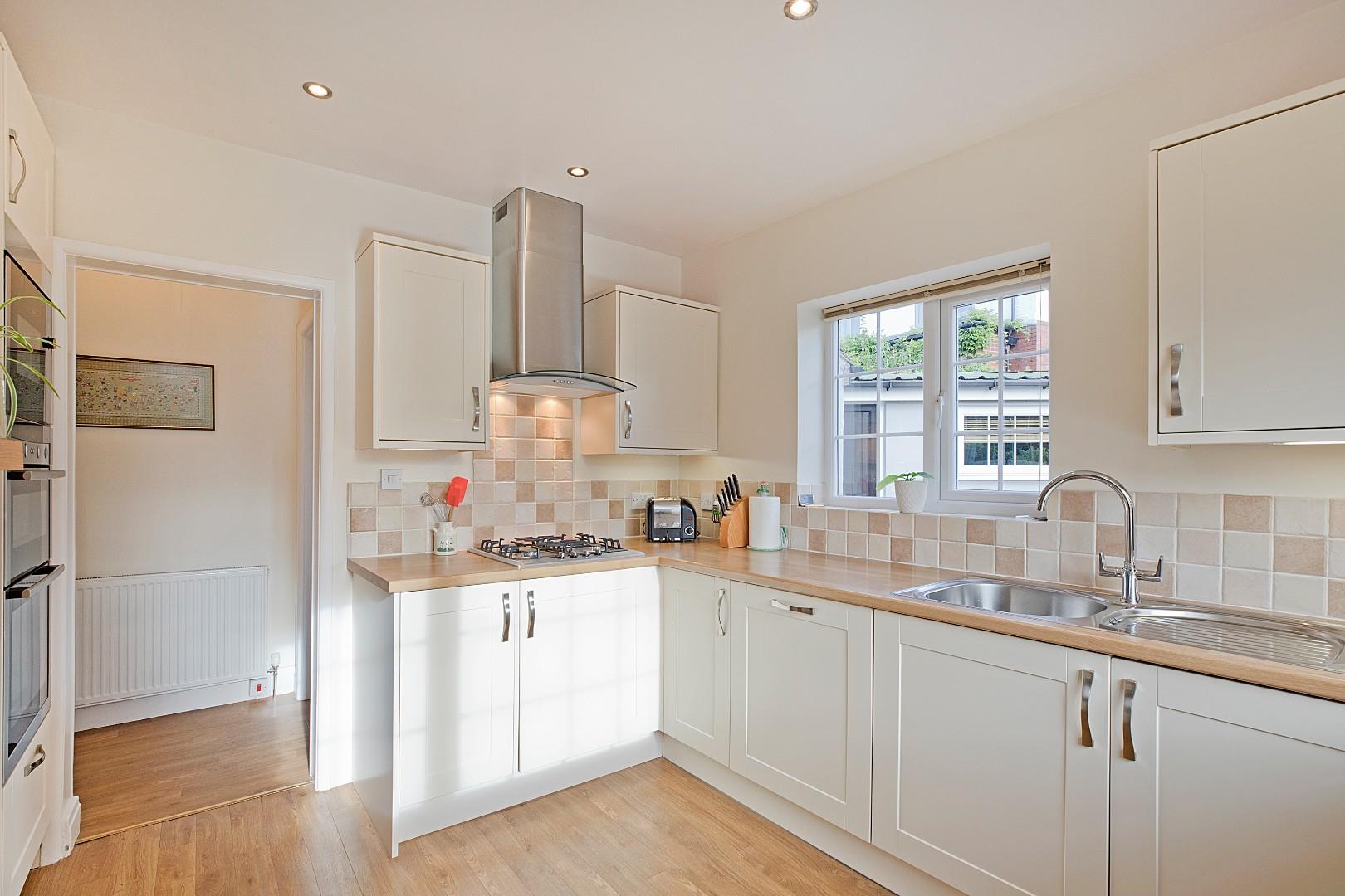A dual aspect breakfast kitchen with cream base and wall units with stainless steel handles, complementary wood effect worksurfaces and tiled splashbacks. Integral appliances include an under counter fridge, washing machine, dishwasher, Neff, double ovens and microwave with grill and Neff, four ring, gas hob with stainless steel and glass extractor over. Amtico flooring, downlighting.