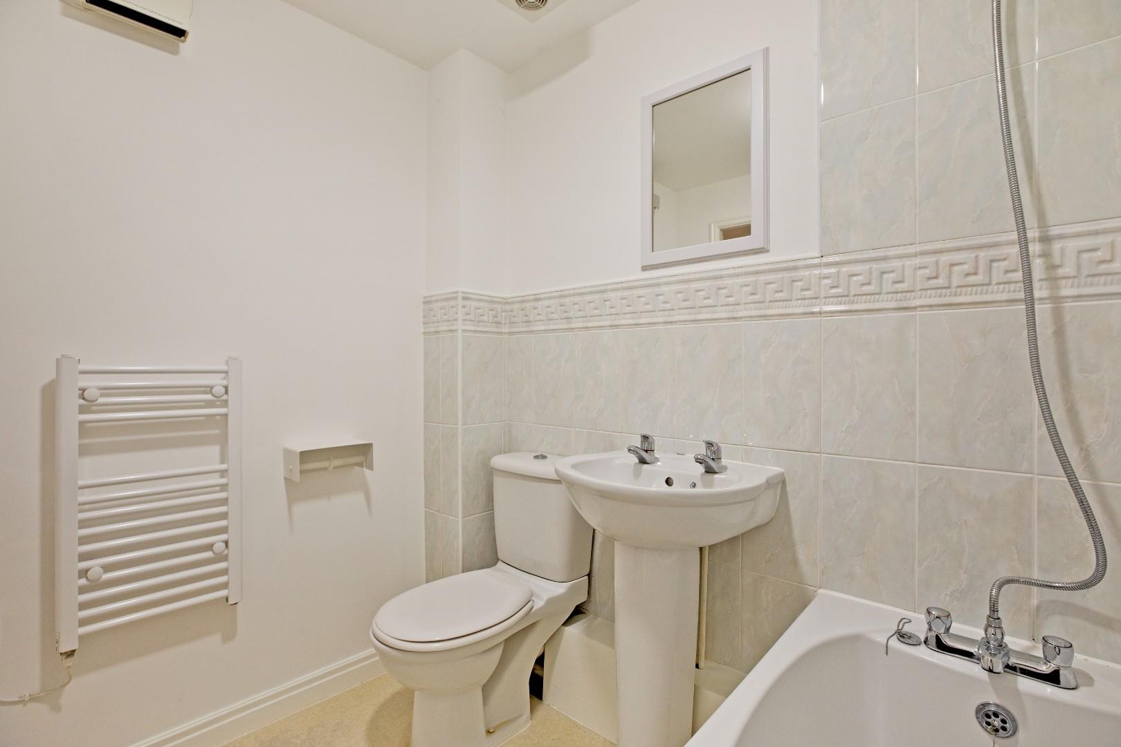 A bathroom fitted with a modern suite incorporating a panel bath with shower over, a pedestal washbasin and a low-level w/c. Fully tiled around the bath and part tiled elsewhere. Complementary vinyl flooring and electric heated towel rail. Extractor fan.