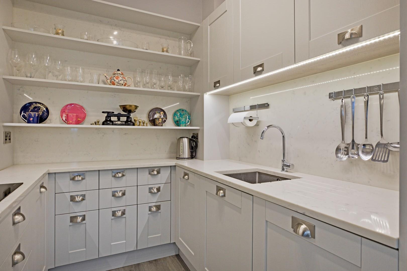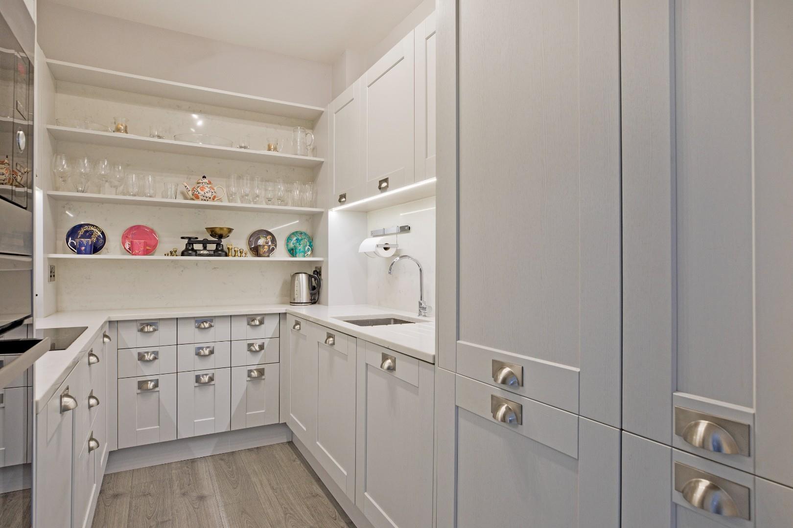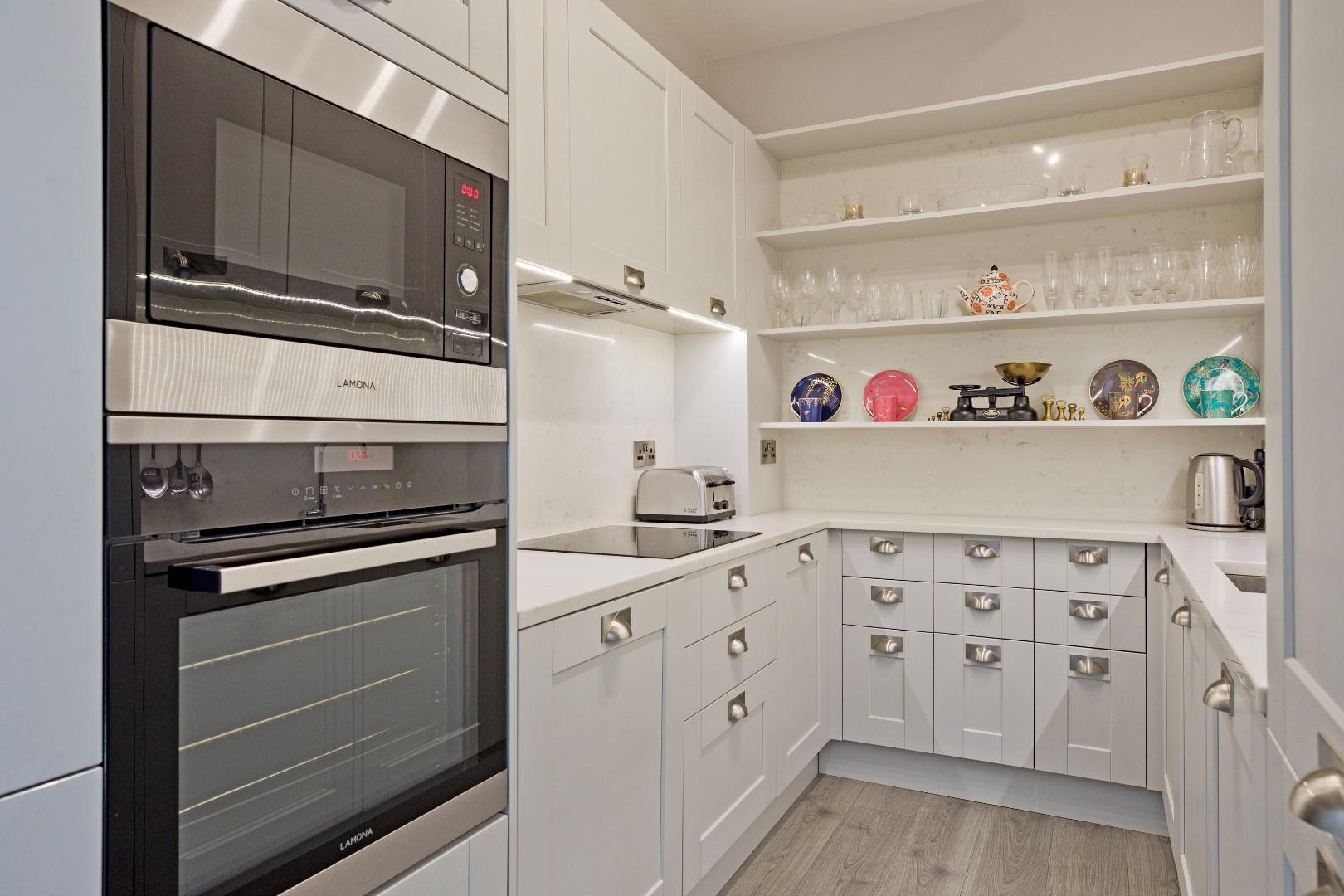 Immaculately presented with soft grey, Shaker style cabinetry with under cabinet lighting, stainless steel cup handles Quartz worksurfaces and tall Quartz splashbacks. Incorporating a full complement of integrated appliances including fridge/freezer, washer/dryer, slimline dishwasher, electric oven, microwave and four ring induction hob with extractor over. Inset, stainless steel sink with chrome mixer tap, wall shelving, useful drawers. Laminate flooring, ceiling lights.