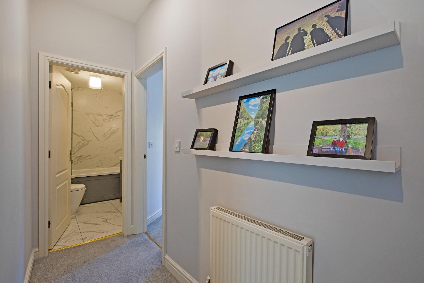 An L-shaped entrance hall with carpeted flooring, radiator and wall shelving, with doors opening into two double bedrooms and the three-piece house bathroom. A further door opens into the lounge with kitchen off.