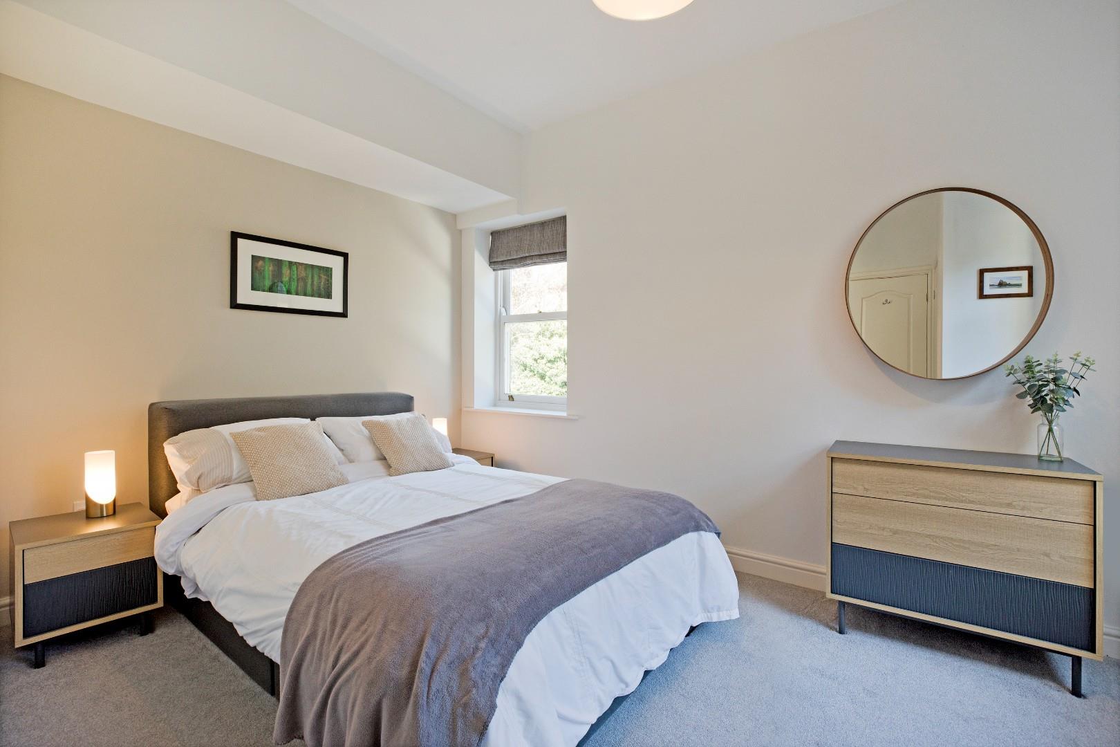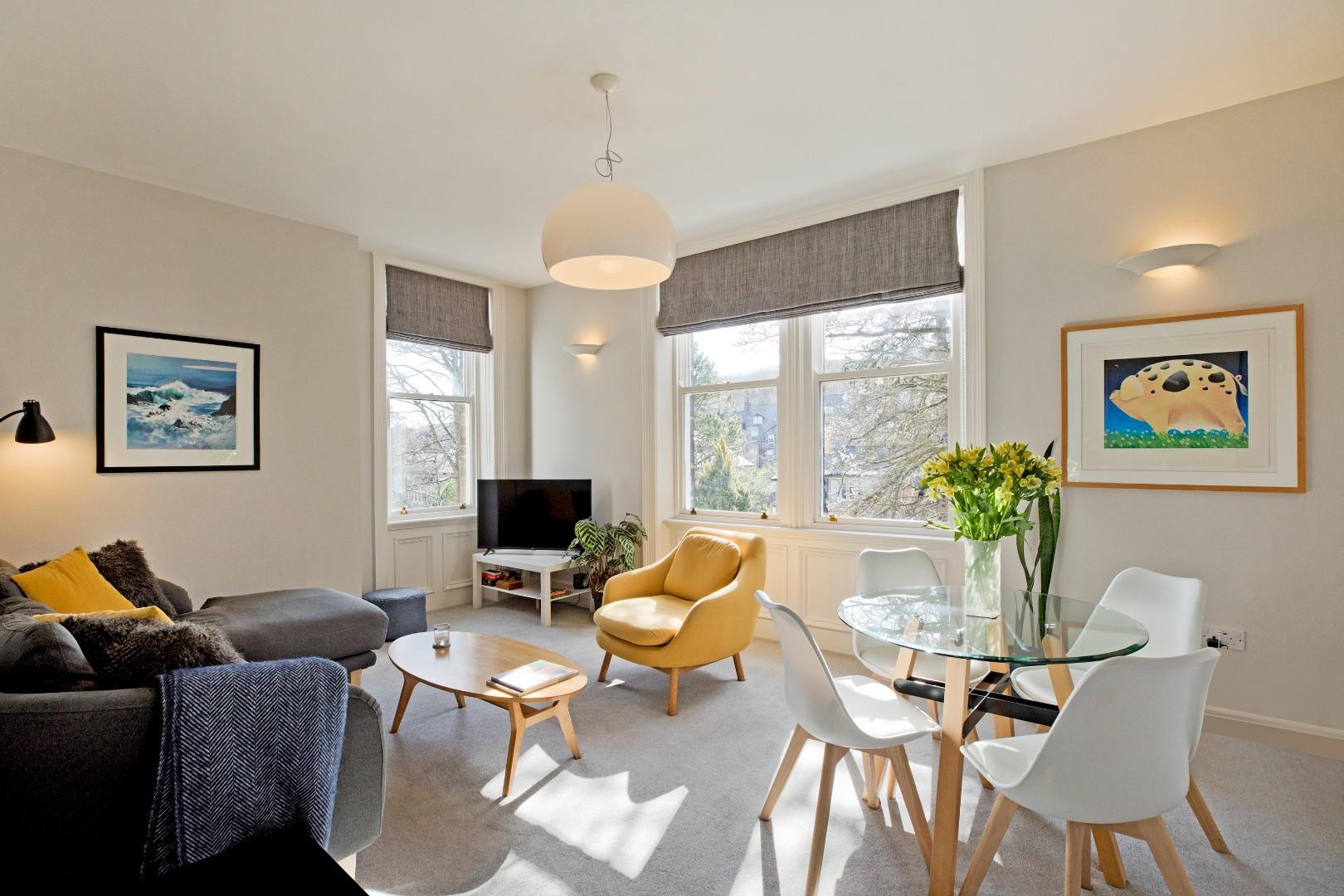A solid timber entrance door opens to the ground floor communal entrance hall of Eldermere House, where a carpeted staircase leads to the first floor landing. The private entrance door of Flat 3 opens into a small hall, ideal for coats and shoes. A door from here leads to an 'L' shaped hall with doors opening into the principal rooms including a beautiful, light filled, dual aspect lounge with ample space for comfortable furniture and a dining table, and a very well appointed, immaculate kitchen with a full complement of integrated appliances. Two double bedrooms, with lovely quiet aspects to the rear of the building, and a beautiful, three-piece house bathroom complete the accommodation in this delightful apartment. Outside the apartment benefits from the well kept communal gardens to the front where there are beautiful shrubs and trees, in addition to a stream meandering through the grounds, with a gated driveway entrance leading to the rear, where there is an allocated parking space with EV charger and visitor parking.