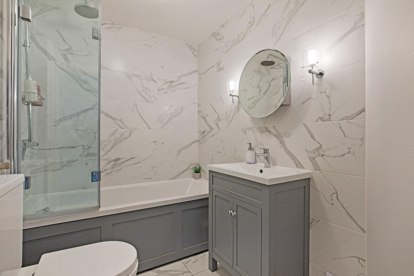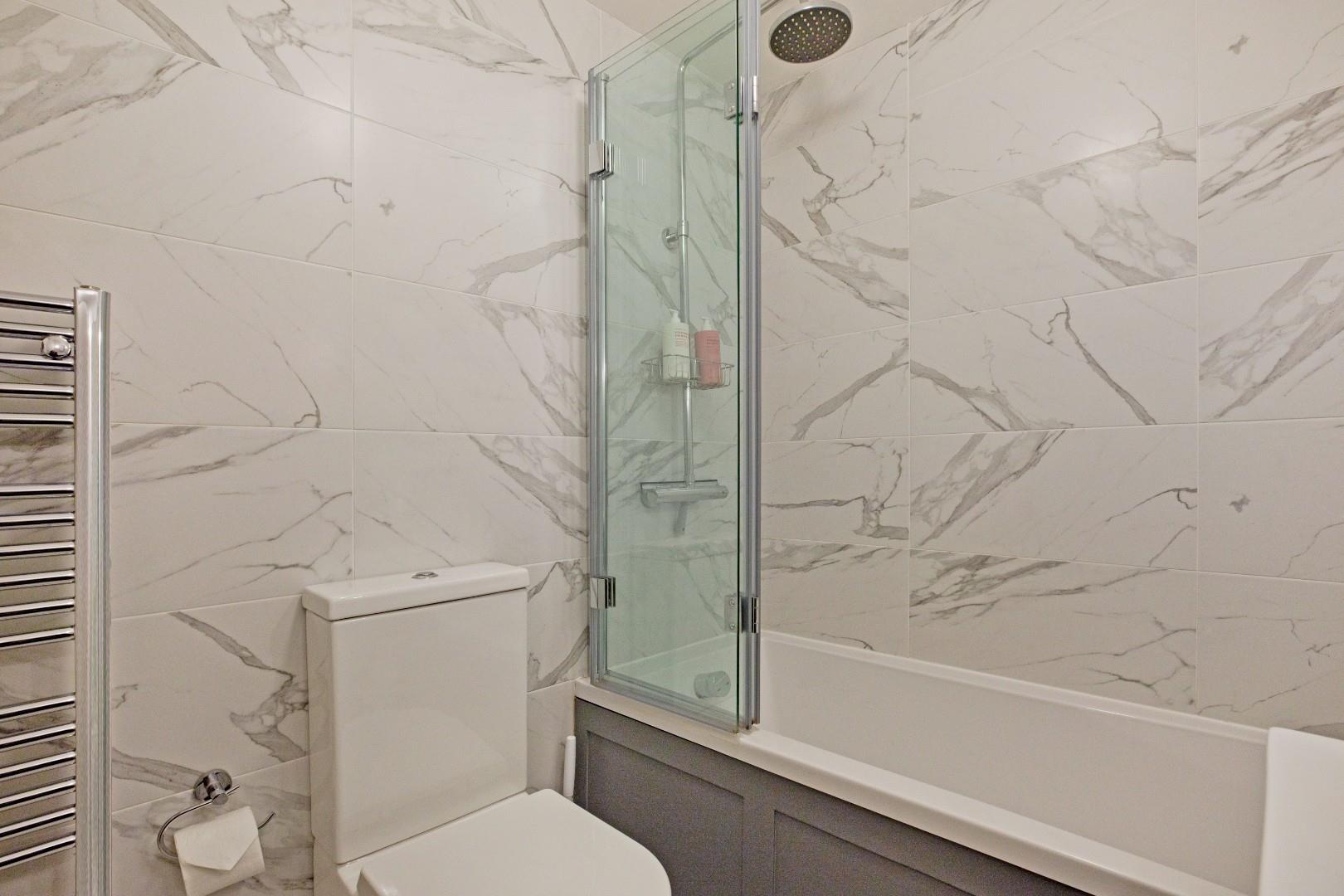 Beautifully presented with low-level W.C., handbasin with chrome mixer tap set in a vanity cupboard and panel bath with thermostatic drench shower, folding glazed screen and attractive, marble effect wall and floor tiling. Wall mounted mirror with adjacent lights, extractor, chrome, ladder style, heated towel rail.