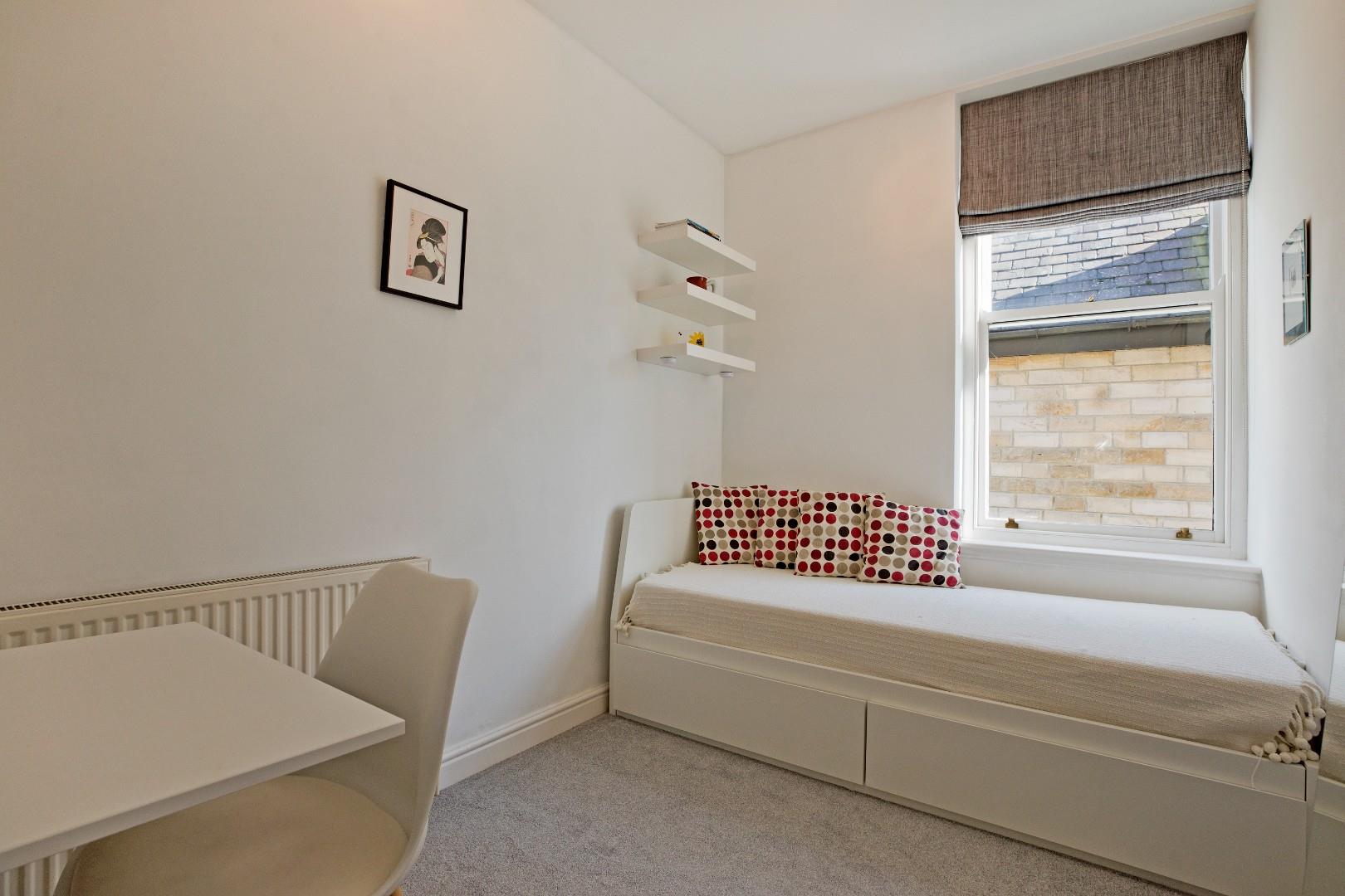 A very well presented, double bedroom with carpeted flooring, double glazed sash window to the side elevation and radiator. Wall mounted, fold down desk, wall shelving.