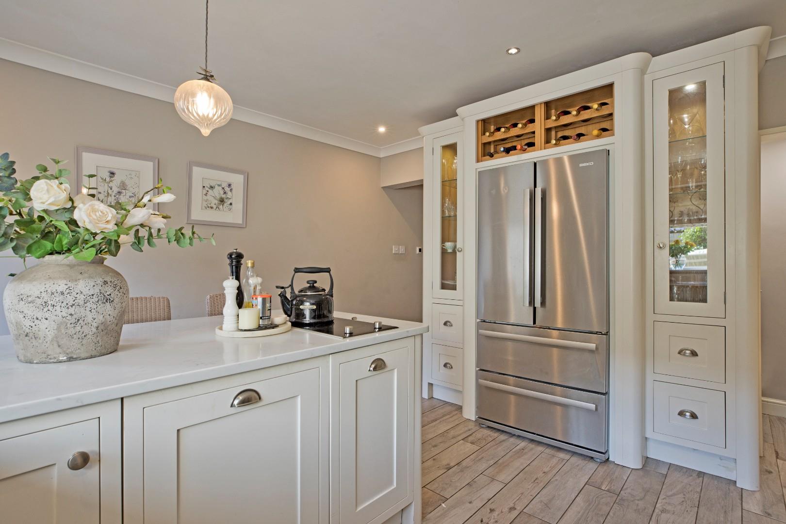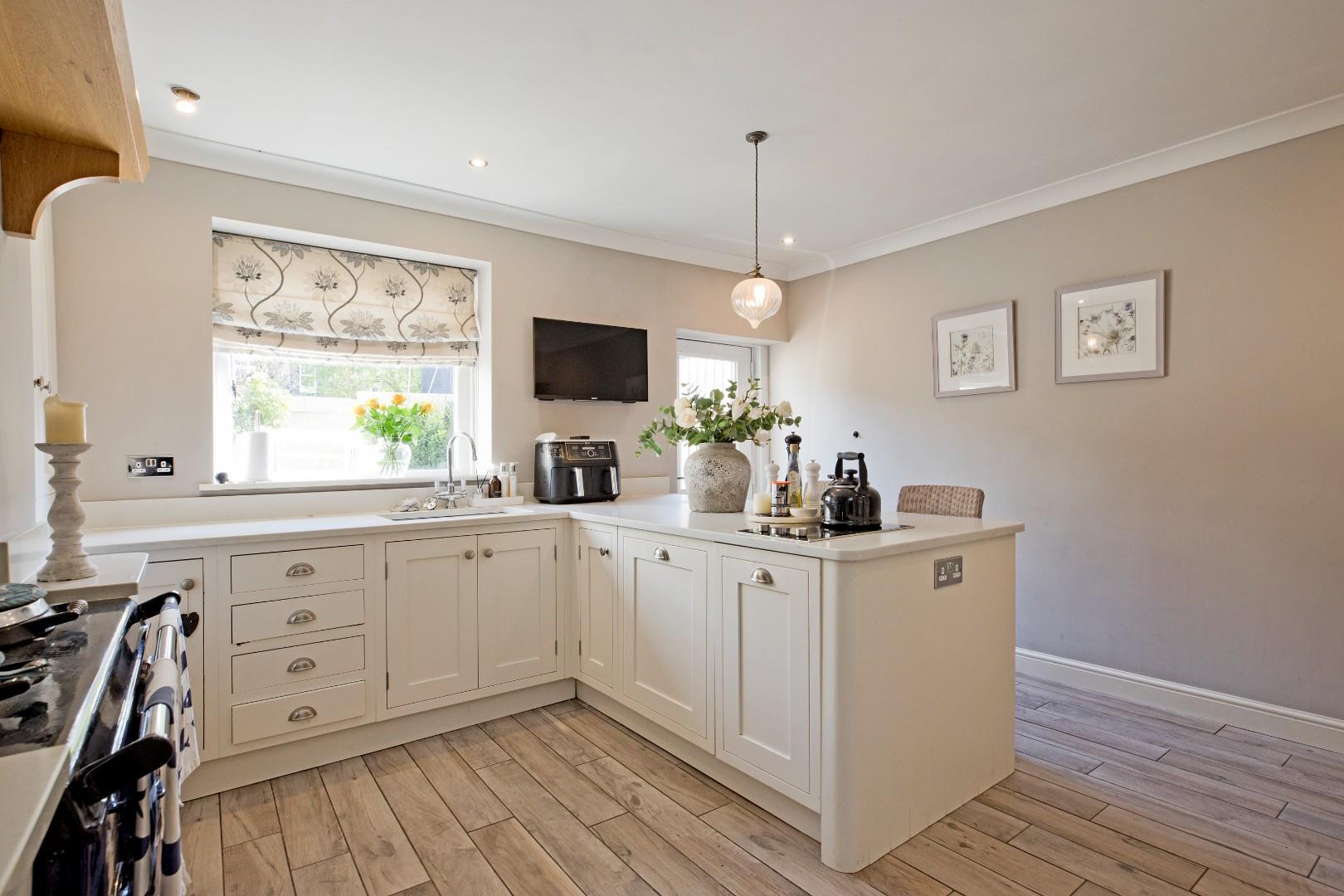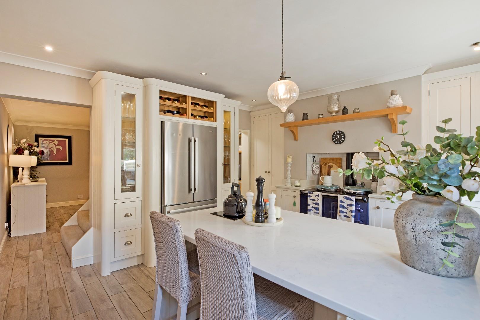 One walks through into a spacious breakfast kitchen, fitted with a range of bespoke, white, Shaker style, base and wall units incorporating display cupboards and wine rack with off-white, solid, marble worksurfaces and upstands. An inset white, composite sink with chrome mixer tap sits under a double-glazed window with aspects over the rear patio garden. There is a return on the marble work surface creating a breakfast bar ideal for grabbing a quick bite when time is short. One’s eyes are drawn to the obligatory, navy-blue AGA range with white, brick effect, tiled splashback, adding to the fantastic homely feel. Integrated appliances include a black, Bosch, two ring induction hob, dishwasher and spacious, double door fridge freezer with pull-out freezer drawers below. A useful under stairs pantry. Continuation of the driftwood effect, ceramic flooring with zonal, underfloor heating. A half-glazed composite door opens onto the spacious, private, patio garden, ideal for relaxing and al fresco entertaining.