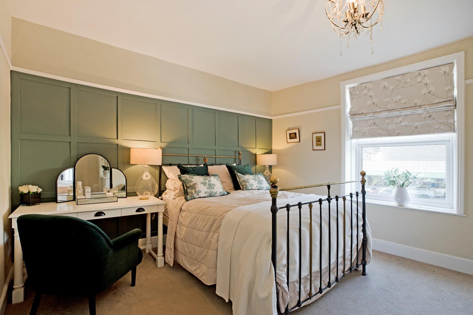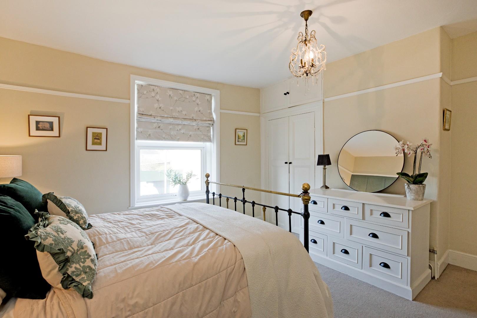 A further double bedroom to the rear with original, stripped pine, fitted cupboards and drawers to one side of the chimney. A double-glazed window overlooks the rear garden. Carpeted flooring.