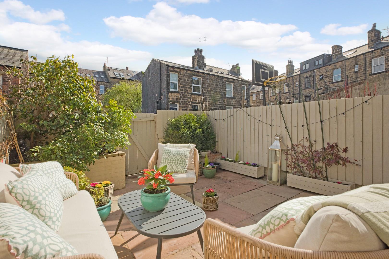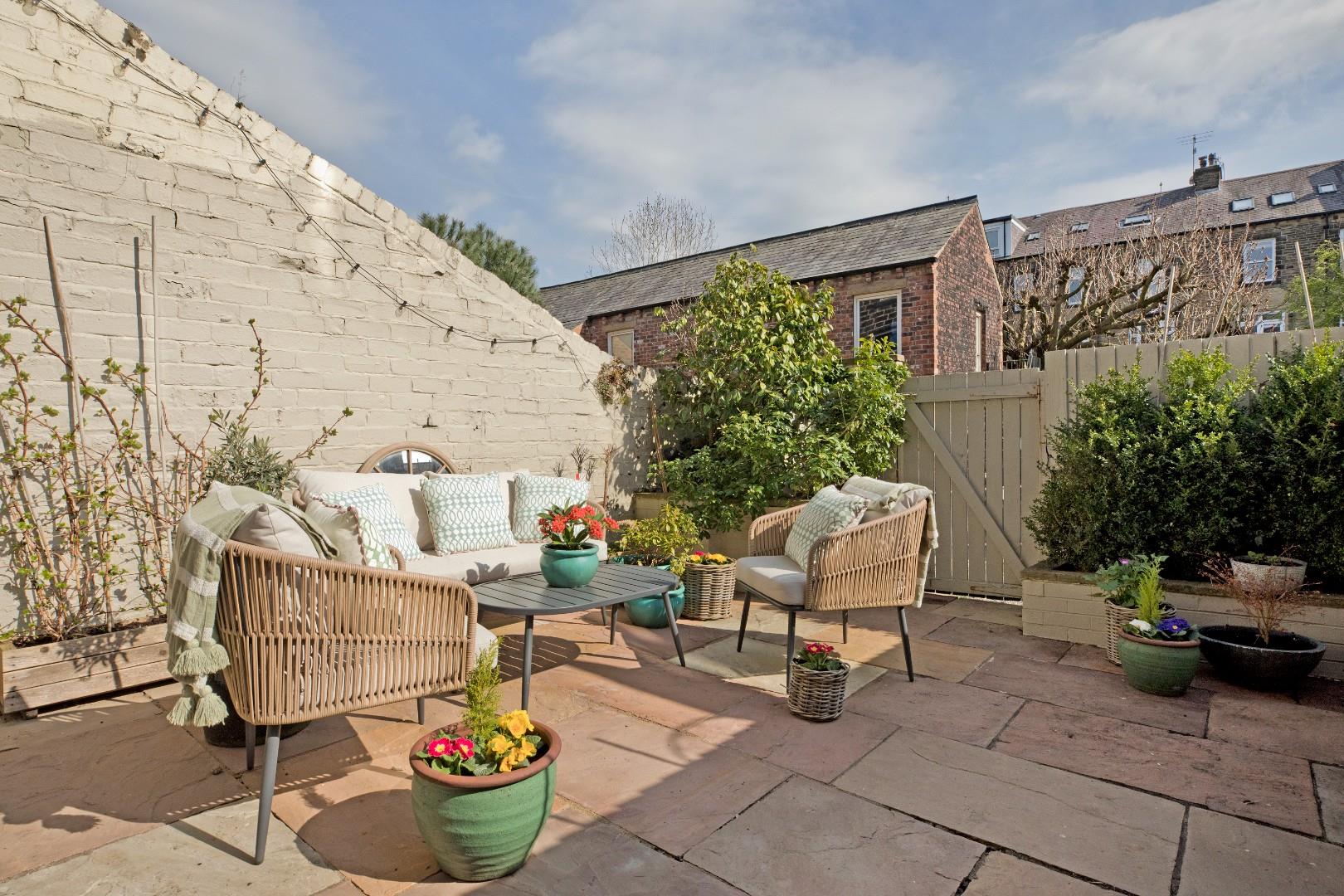 To the front is an area of low maintenance lawn ,bound by with slate chippings, having tall hedging for privacy. The true piece de la resistance is the bright and sunny, private, rear patio garden accessed from the kitchen through a stable style door, with a large, stone flagged, patio area, creating an external room - ideal for relaxing and al fresco entertaining. Tall fencing maintains privacy and a gate leads to a rear access lane giving access to private parking.