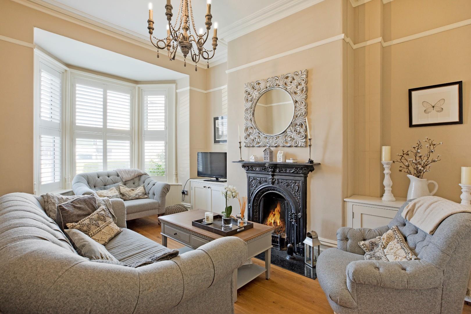 This is a most charming and well-proportioned lounge with original, deep cornicing and picture rail. One’s eyes are immediately drawn to the original, heavy, cast iron working fireplace standing on a granite hearth and one can imagine that this is a very cosy spot on a cold winter’s night. Either side of the chimney breast are newly fitted cupboards complementing the traditional style of this room. A tall, bay window allows the natural light to flood in and is fitted with white, colonial style shutters, maintaining privacy. The engineered oak flooring continues through, creating a perfect blend of traditional and contemporary styling.
