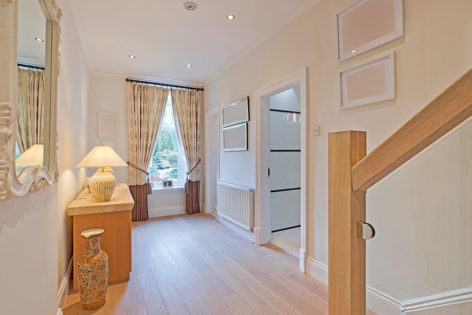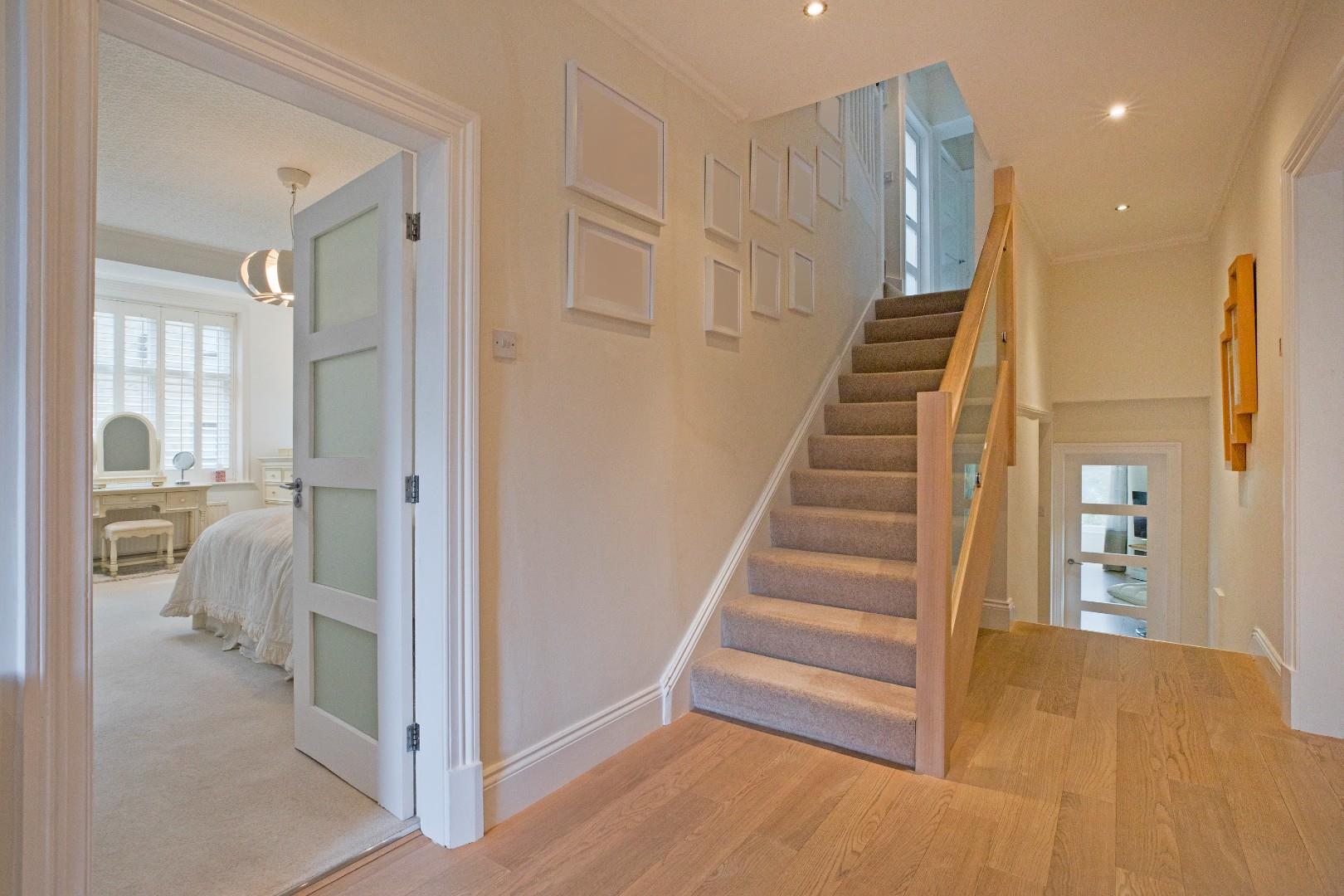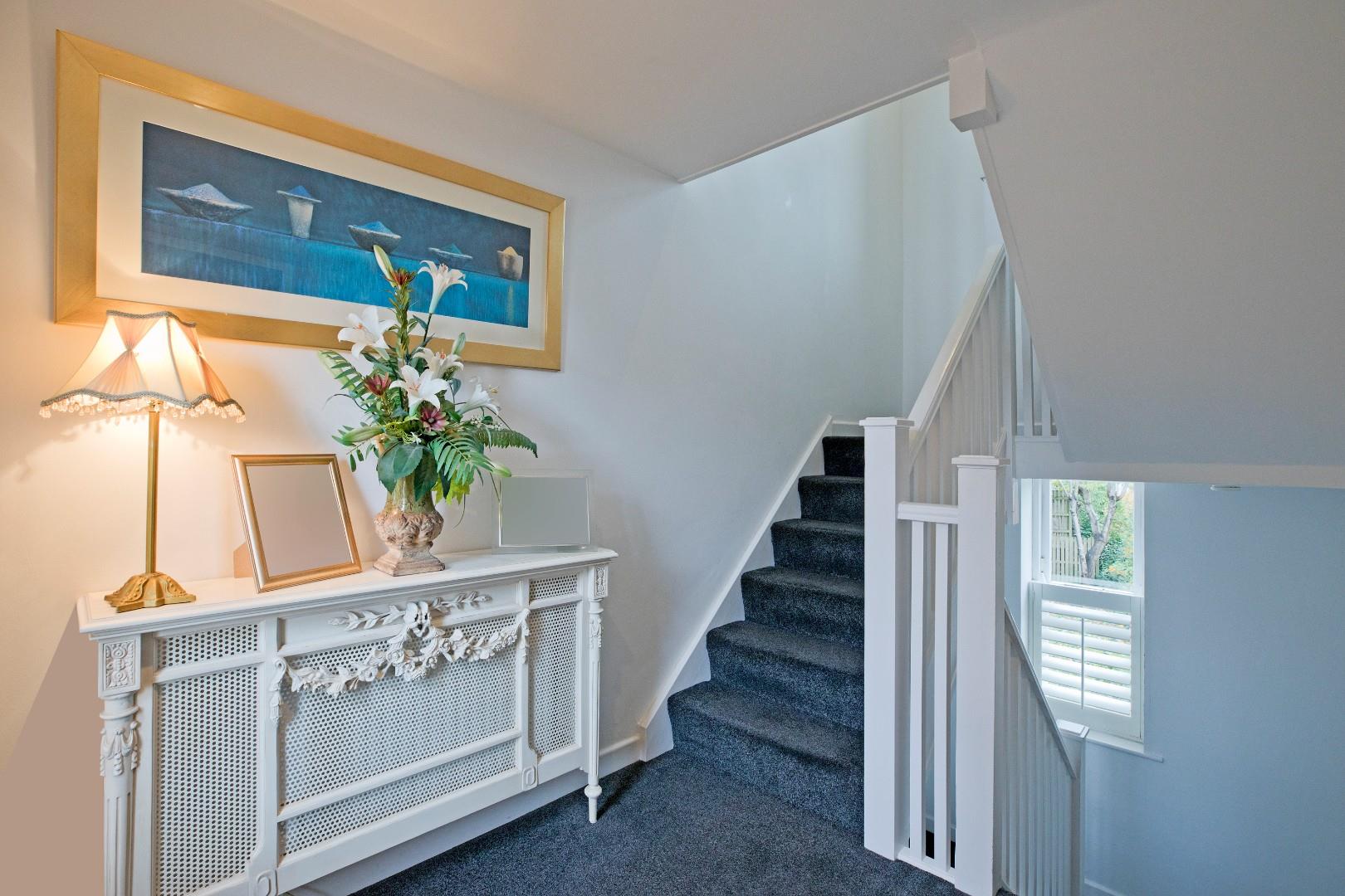 A door from the sitting room opens into a very generous hallway with space for several items of furniture. A window with shutters to the east facing elevation allows for ample natural light. Laminate flooring and radiator. A broad, carpeted staircase with stylish timber balustrade with glazed panels leads to the second floor. An understairs cupboard provides useful storage.