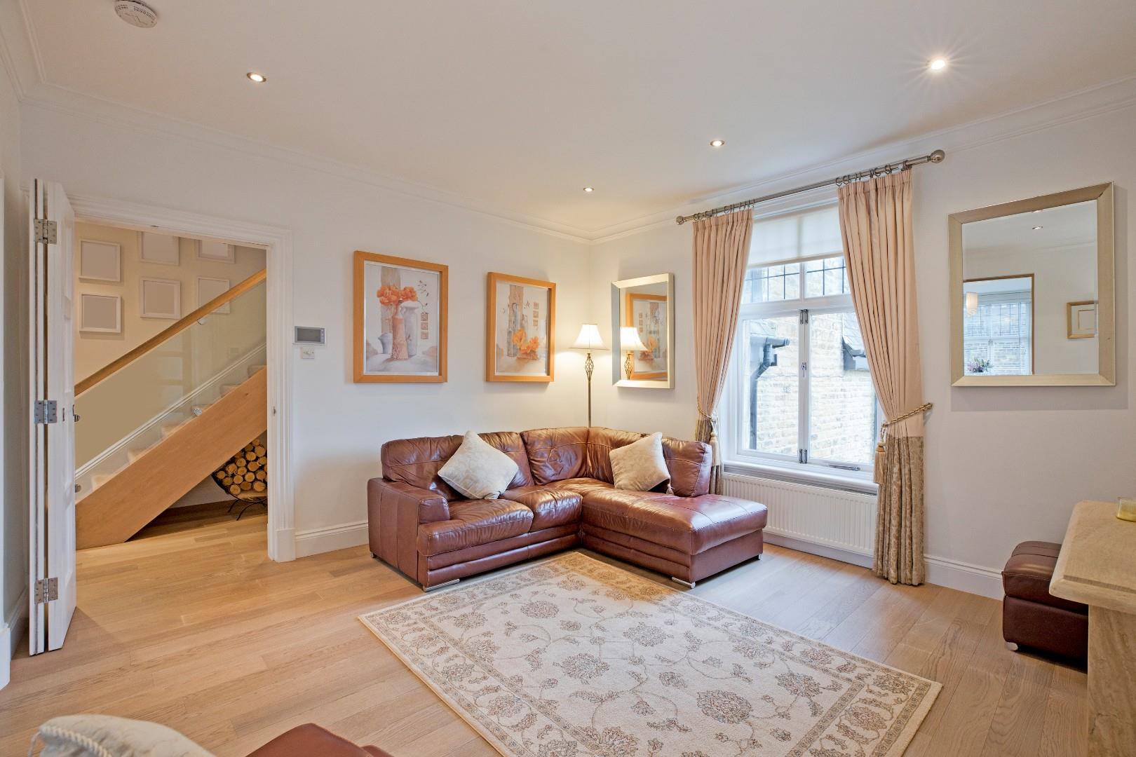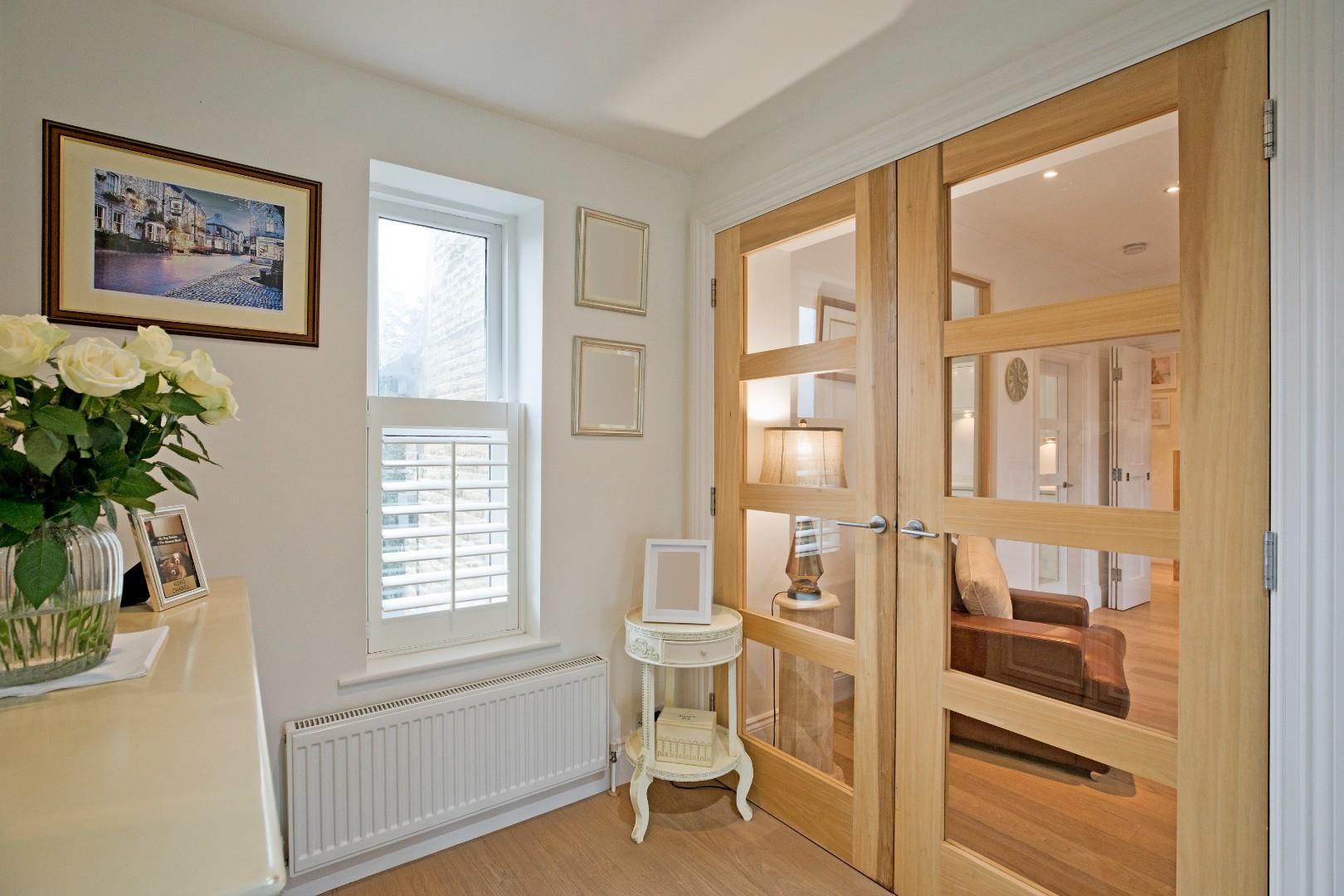 The return staircase first leads to a landing with ample natural light provided by a window on the staircase with shutters and a further window with shutters to the front elevation. Carpeting, radiator with attractive radiator cover and room for an item of furniture. The carpeted staircase continues to the first floor accommodation from which a further good-sized landing area leads into the sitting room through glazed, double doors. Window to the front elevation with shutters, radiator, laminate flooring and space for several pieces of furniture.