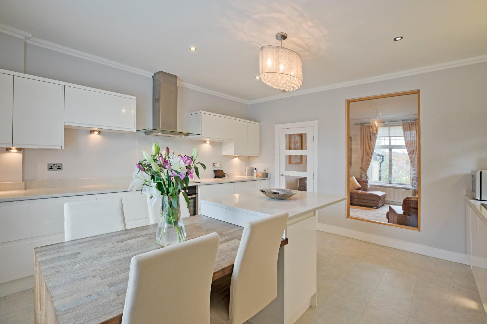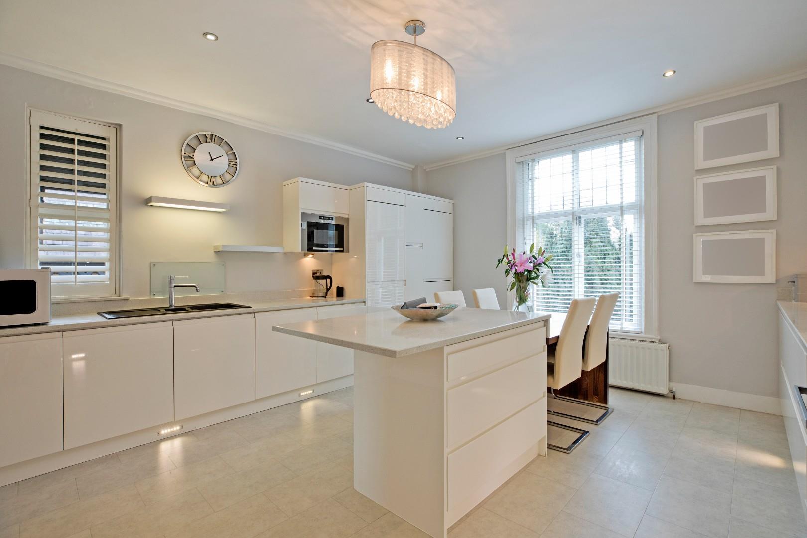 A beautifully appointed, modern kitchen fitted with contemporary base and wall units providing an abundance of storage with quartz worksurface and upstands over. Integrated appliances include an electric oven with induction hob, glass splashback and stainless-steel chimney hood and extractor over, microwave, dishwasher, fridge/freezer and a washing machine/tumble drier. Composite one and a half bowl sink with drainer, monobloc tap and glass splashback, under unit lighting, under pelmet lighting and downlighting. Karndean flooring, cornicing and radiator. This is a wonderful environment in which to enjoy mealtimes with family or to entertain. A large island with breakfast bar is a great spot to sit and enjoy a coffee and there is also room for a dining table should one so wish. A cupboard houses the central heating boiler. Dual aspect windows make for a bright atmosphere. Planning permission was previously granted for a Juliet balcony, which has now lapsed.