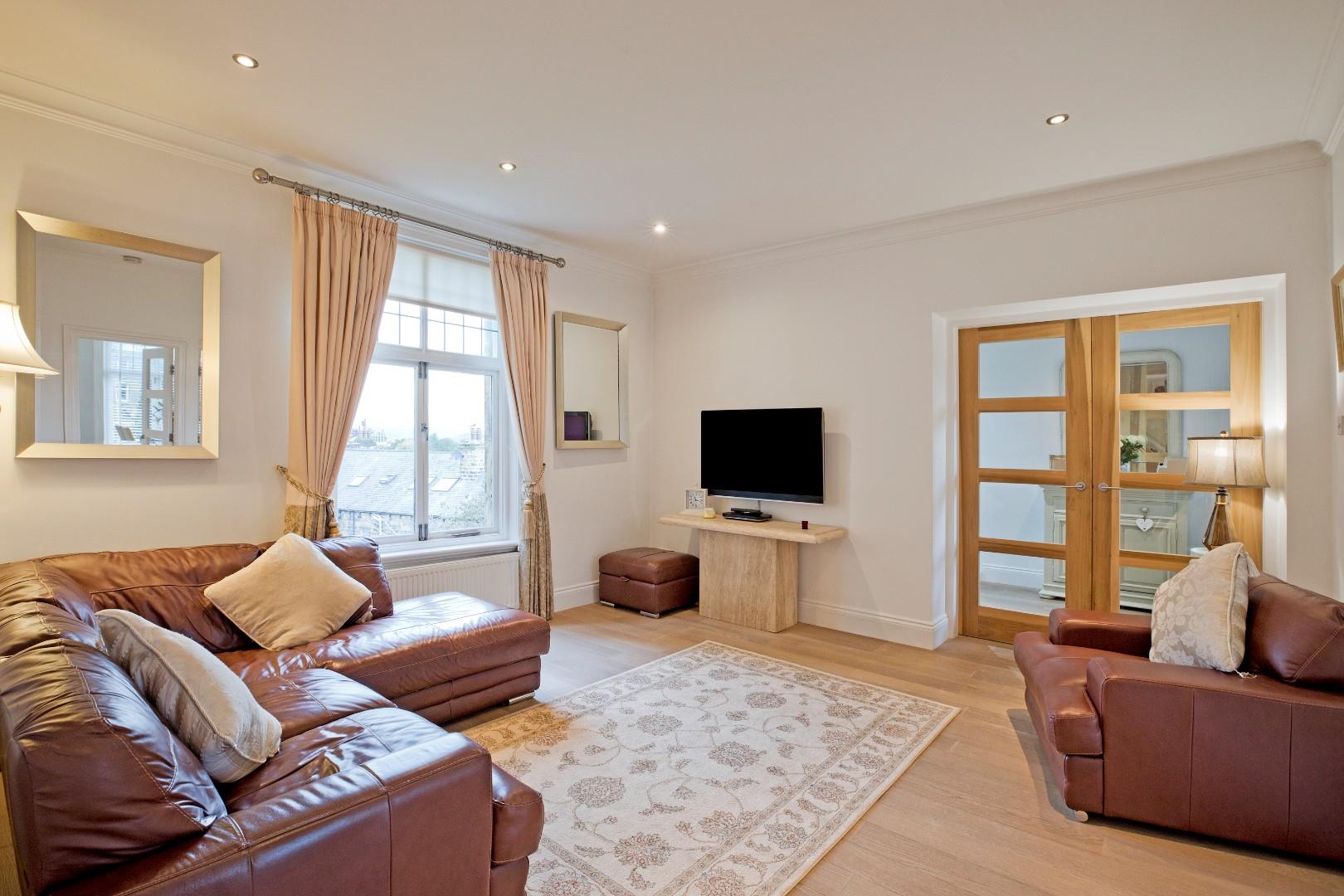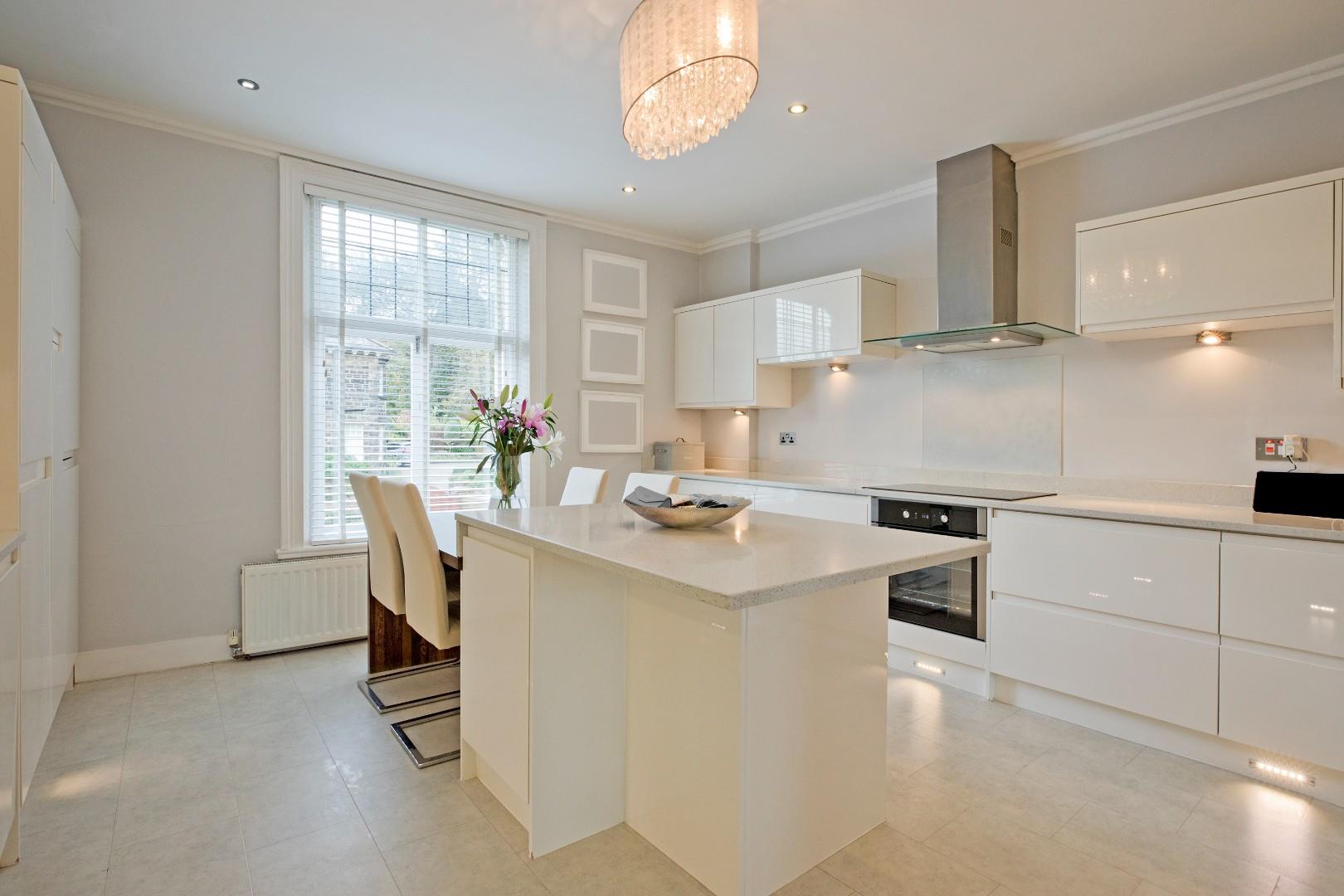 A lovely sitting room benefitting from generous proportions and a large window affording a delightful view over Ilkley and towards the hills in the background. Cornicing and high ceilings lend character. Laminate flooring, two radiators, downlighting and TV point. This living area creates a great-sized entertaining space with it adjoining the spacious kitchen with a tall window allowing light to flow through between these two generous rooms, creating a light and airy feel. This could also serve well as a formal dining room with ample space for comfortable seating if desired.