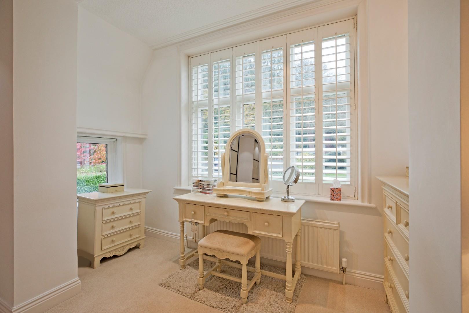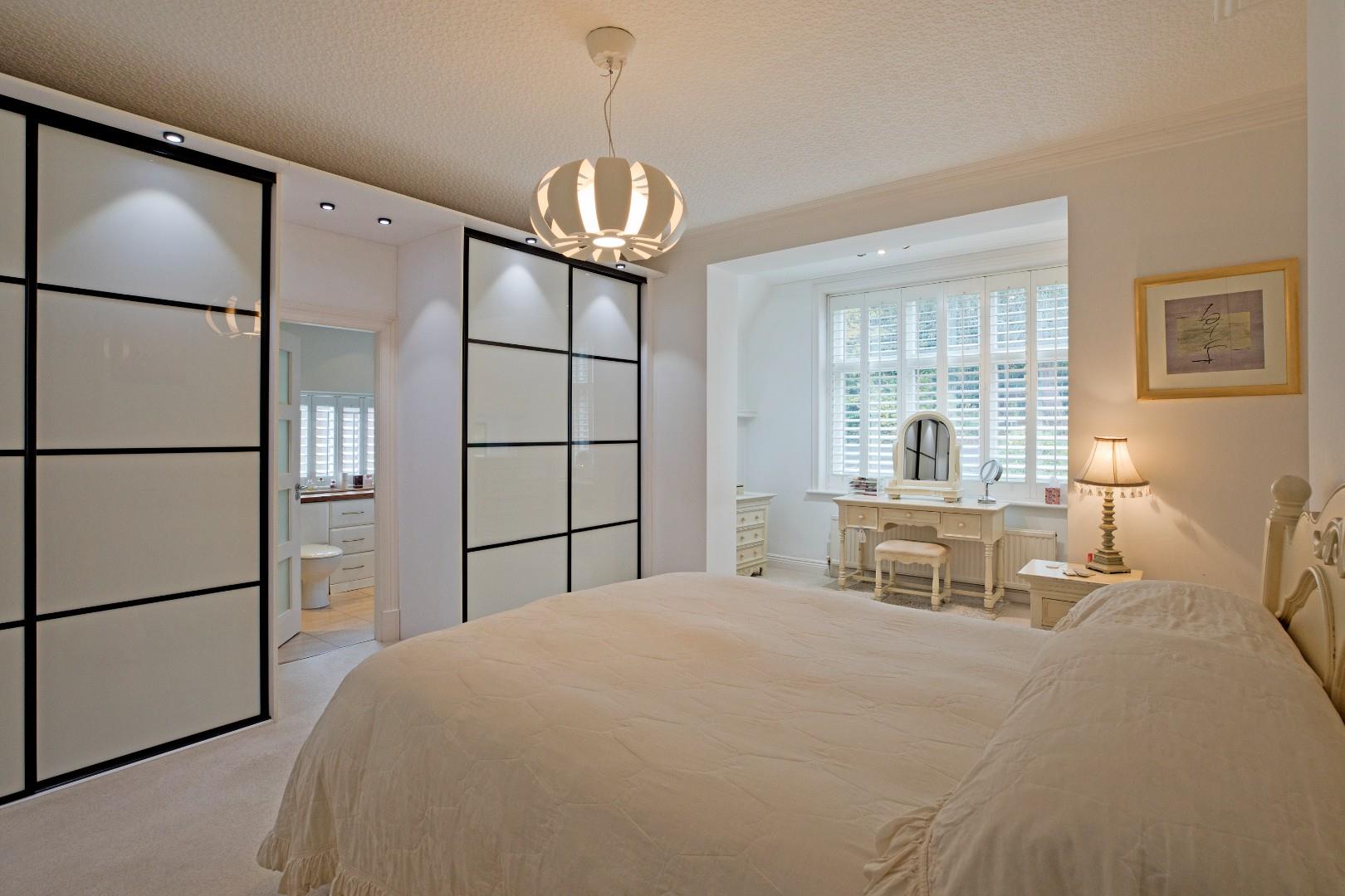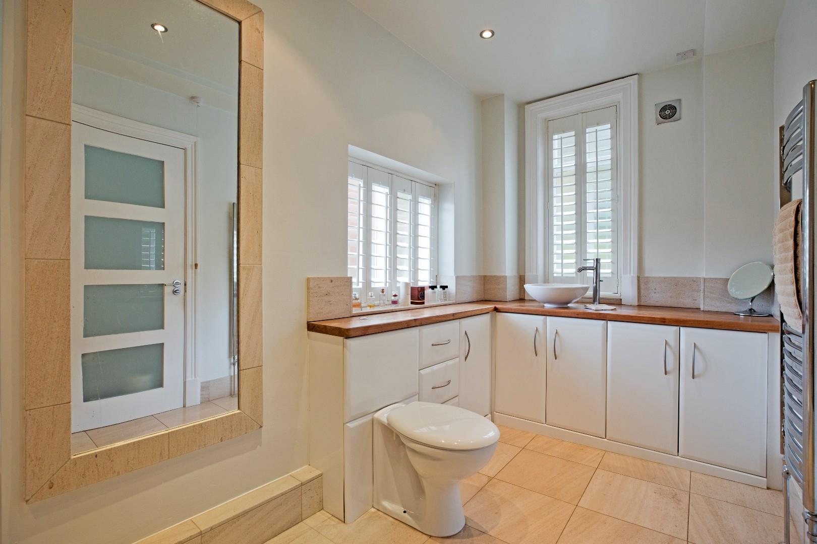 A spacious, well-appointed en suite incorporating a large, fully tiled walk-in shower with glazed door and mains thermostatic shower, a vanity washbasin consisting of a circular basin with monobloc tap and cupboards and drawers below and a concealed cistern w/c. Dual aspect windows with fitted shutters. Tall, chrome, ladder, towel radiator, ceramic tiled floor, large, fitted, full length mirror, downlighting and extractor fan.