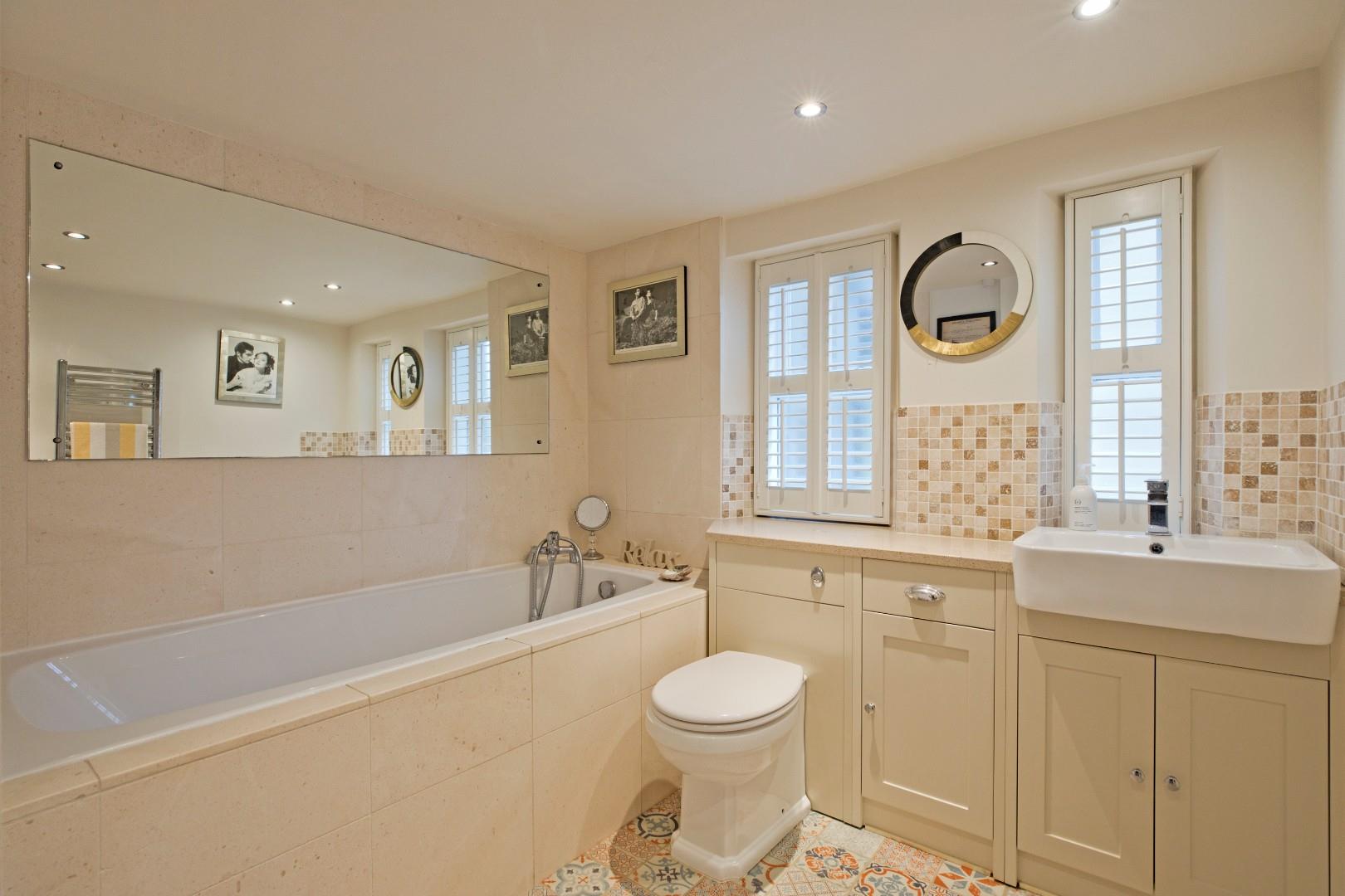 A modern bathroom fitted with a deep fill bath with mixer tap and hand held shower attachment, a vanity washbasin with monobloc tap and a concealed cistern w/c with pushbutton flush incorporated within a stylish unit affording a good amount of storage with mosaic effect splashback tiling. Fully tiled around the bath in large, neutral tiles. Attractive, complementary, tiled effect, vinyl flooring. Chrome, ladder, towel radiator, large fitted wall mirror and downlighting. Two windows with shutters allow for ample natural light.